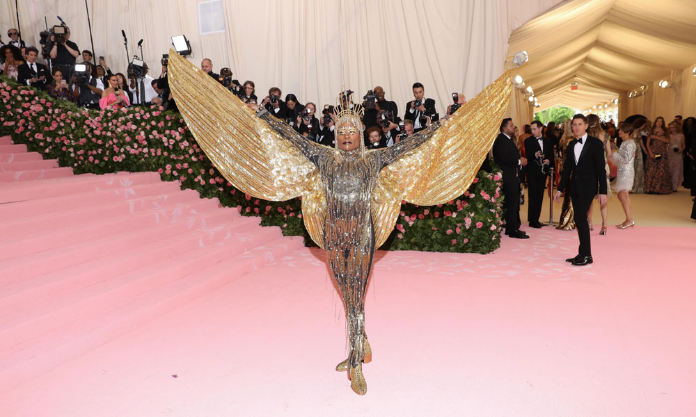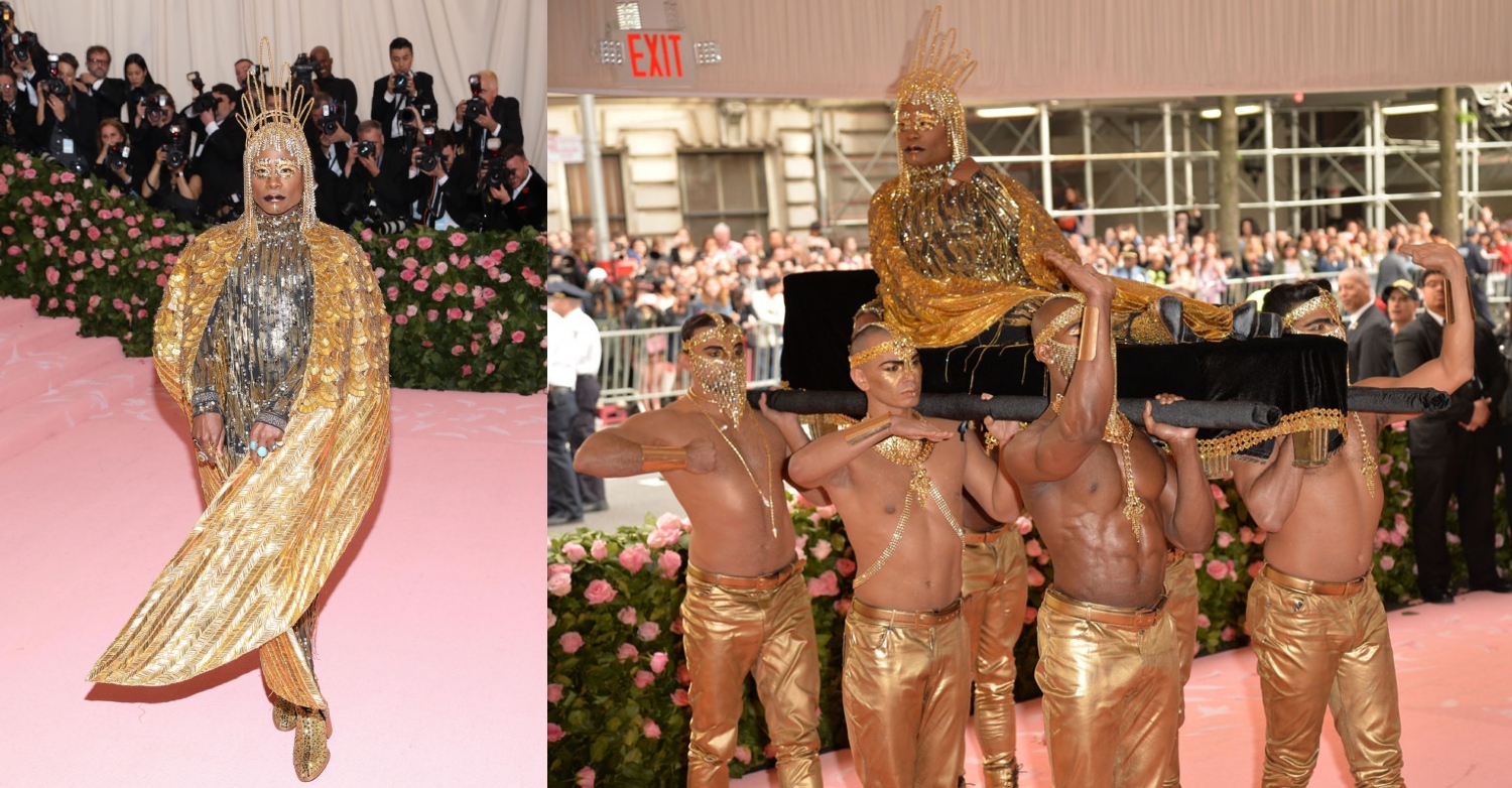 …At the 2019 event, whose “Camp: Notes on Fashion” theme inspired many over-the-top looks, Billy dressed as an Egyptian god in an all-gold outfit complete with wings and a chain headdress. He also arrived on the carpet on a cushioned platform carried by six shirtless men in matching gold pants.