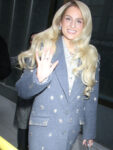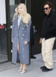 Meghan Trainor at the Live With Kelly And Mark show studios 11-25-25. She is wearing a weird blue wool dress coat with rhinestones on it