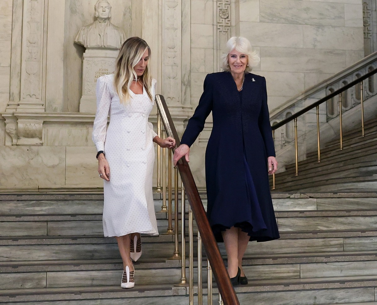 Here are some assorted photos of Queen Camilla during this week’s US state visit. I’m including new photos of Camilla on Wednesday at the New York Public Library, where she had an event for the Queen’s Reading Room alongside Sarah Jessica Parker, Anna Wintour and Jenna Bush Hager. Camilla wore a navy silk crepe dress by Fiona Clare for that event and the walk-through of the 9/11 Memorial. She paired the dress with the Diamond Brittannia Brooch.