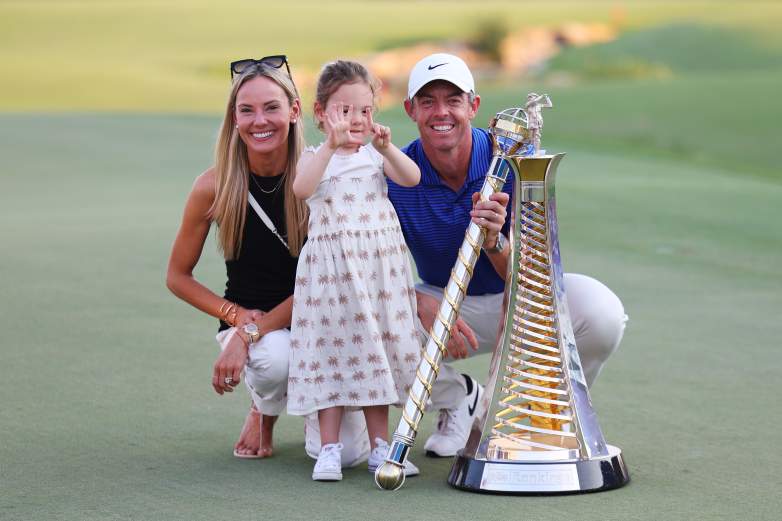 GettyDUBAI, UNITED ARAB EMIRATES – NOVEMBER 17: Rory McIlroy of Northern Ireland smiles with his Wife, Erica Stoll and Daughter, Poppy McIlroy, who gestures ‘six’ for his sixth Race to Dubai title, alongside the DP World Tour Championship trophy and the Race to Dubai trophy on the 18th green following victory on day four of the DP World Tour Championship 2024 at Jumeirah Golf Estates on November 17, 2024 in Dubai, United Arab Emirates. (Photo by Andrew Redington/Getty Images)