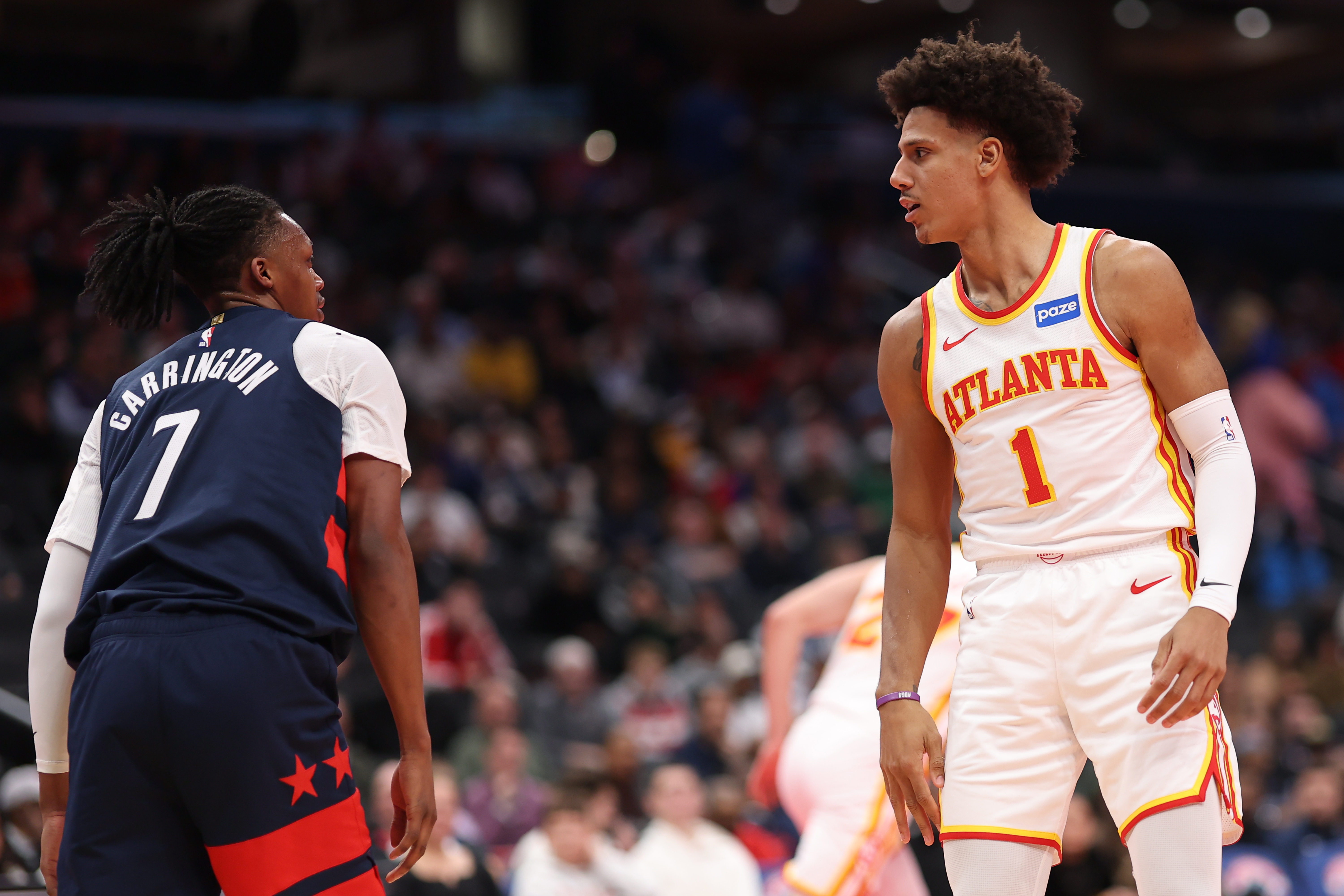 GettyWASHINGTON, DC – NOVEMBER 25: Jalen Johnson #1 of the Atlanta Hawks stares down Bub Carrington #7 of the Washington Wizards after blocking his dunk during the first half of an Emirates NBA Cup game at Capital One Arena on November 25, 2025 in Washington, DC. (Photo by Patrick Smith/Getty Images)