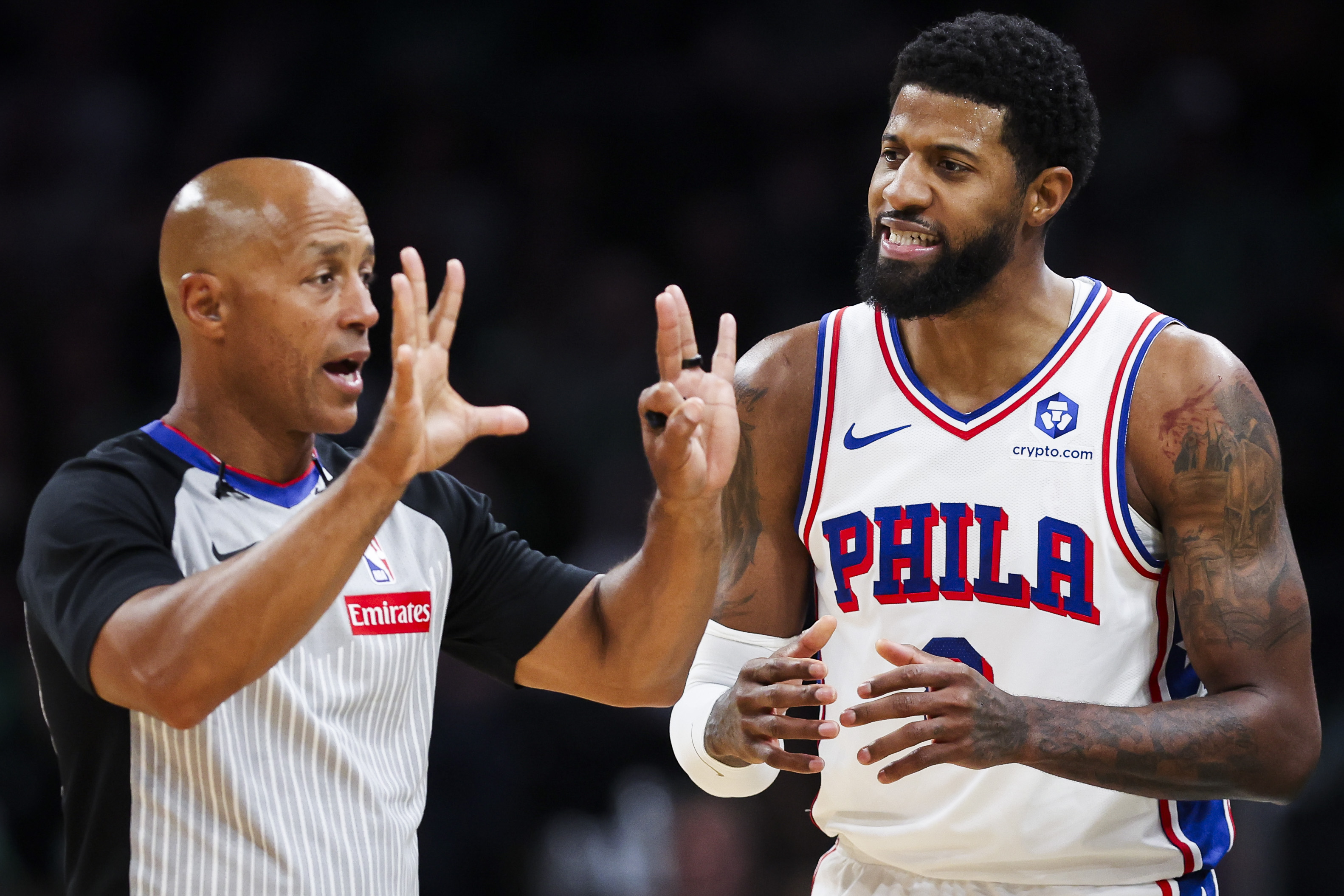GettyPaul George #8 of the Philadelphia 76ers talks to the referee in the second quarter of a game against the Boston Celtics at TD Garden on April 21, 2026 in Boston, Massachusetts.