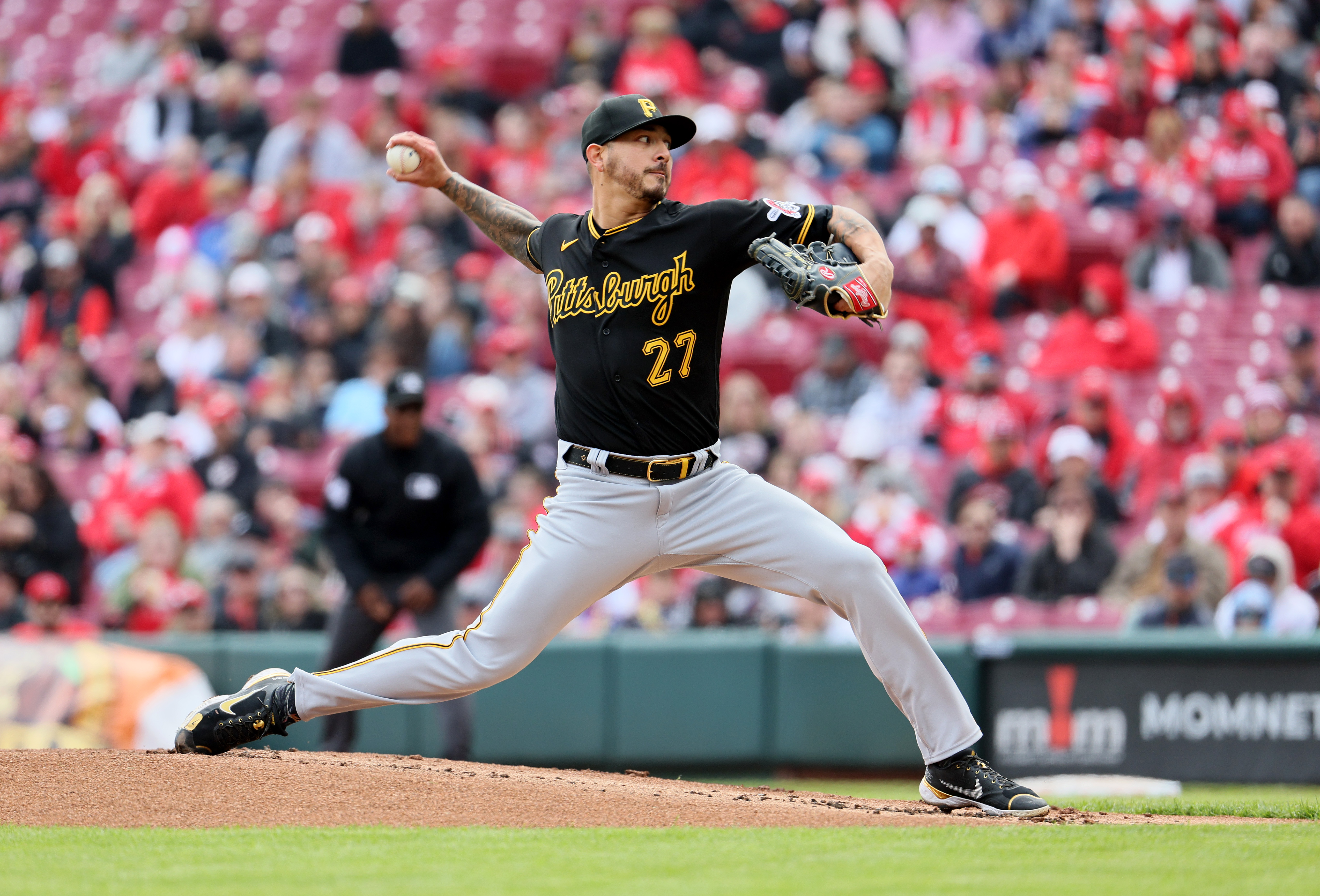 GettyVince Velasquez #27 of the Pittsburgh Pirates throws a pitch against the Cincinnati Reds at Great American Ball Park on April 02, 2023 in Cincinnati, Ohio.