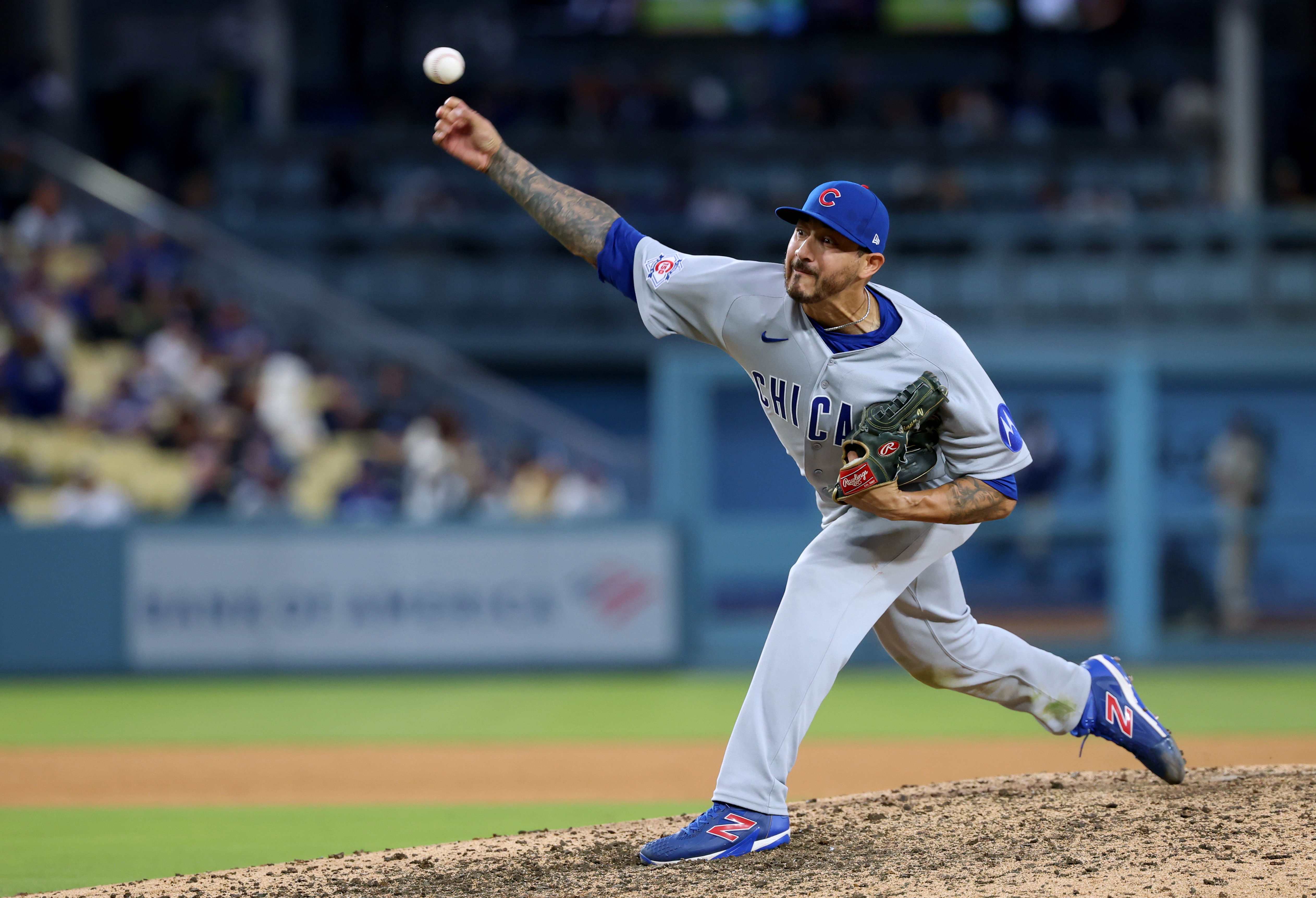 GettyVince Velasquez #56 of the Chicago Cubs pitches in relief during the eighth inning during the game against the Los Angeles Dodgers at Dodger Stadium on April 25, 2026 in Los Angeles, California.