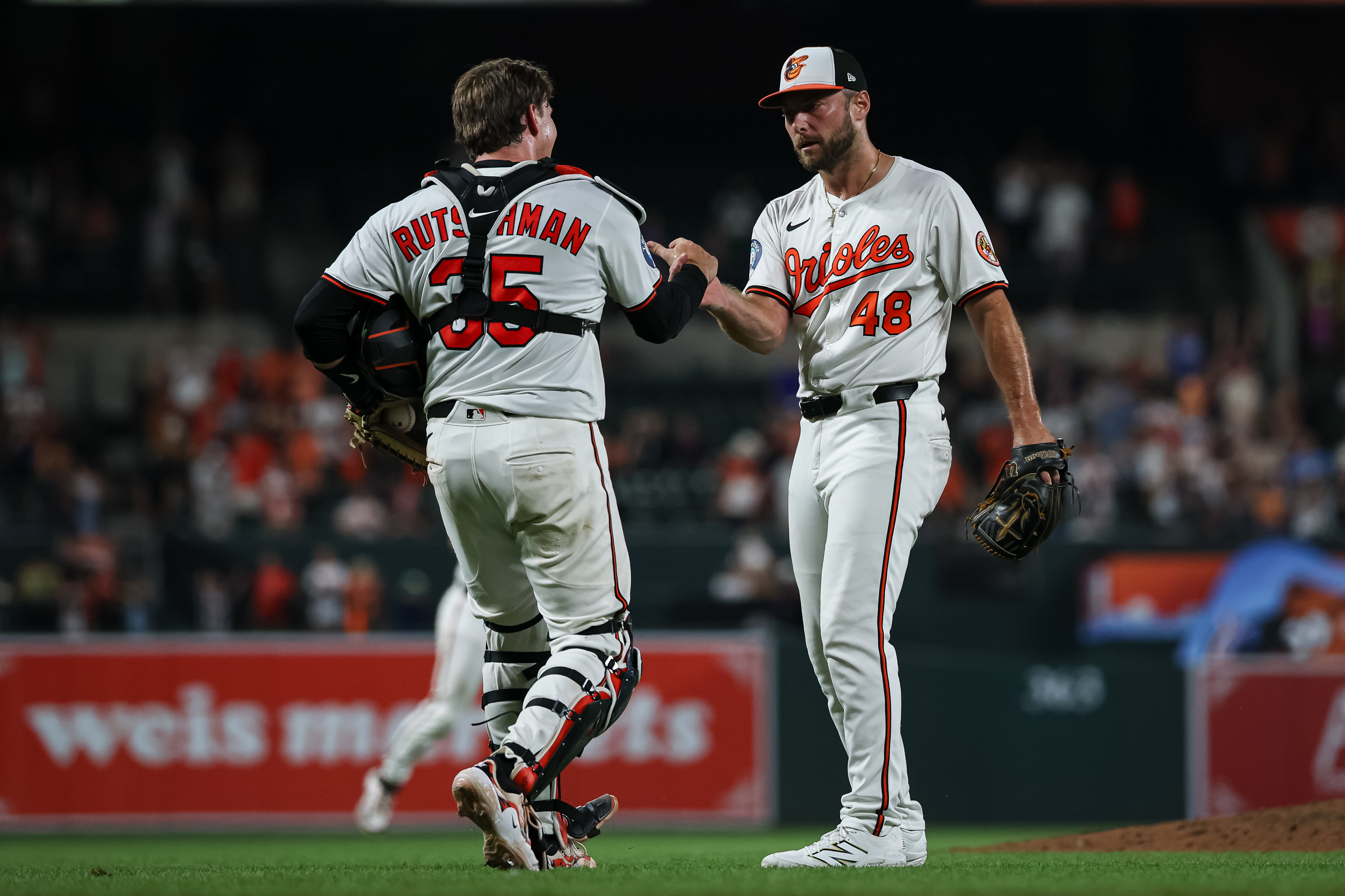 GettyAdley Rutschman #35 and Corbin Martin #48 of the Baltimore Orioles celebrate a 3-2 win in game two of a split doubleheader against the Toronto Blue Jays at Oriole Park at Camden Yards on July 29, 2025 in Baltimore, Maryland.