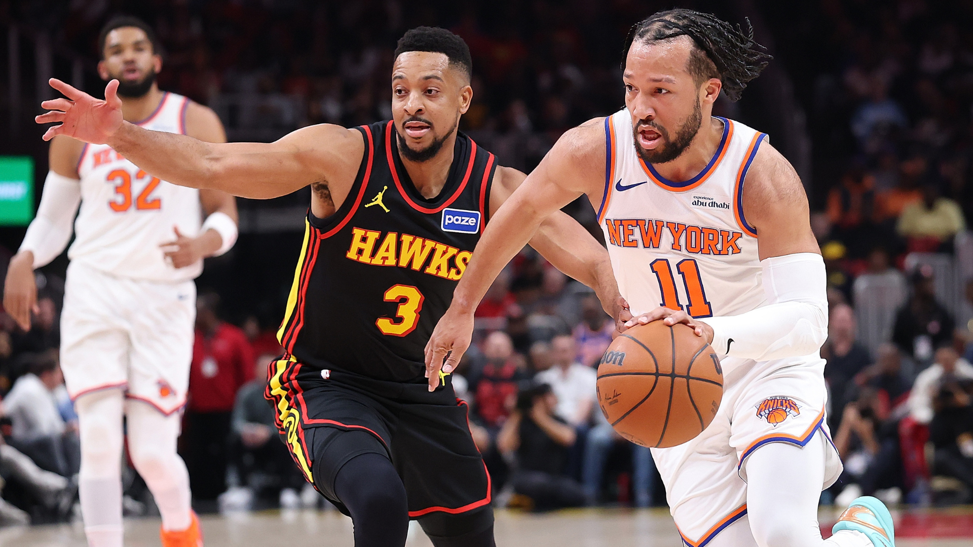 GettyJalen Brunson #11 of the New York Knicks drives against CJ McCollum #3 of the Atlanta Hawks during the first quarter at State Farm Arena on April 06, 2026 in Atlanta, Georgia.