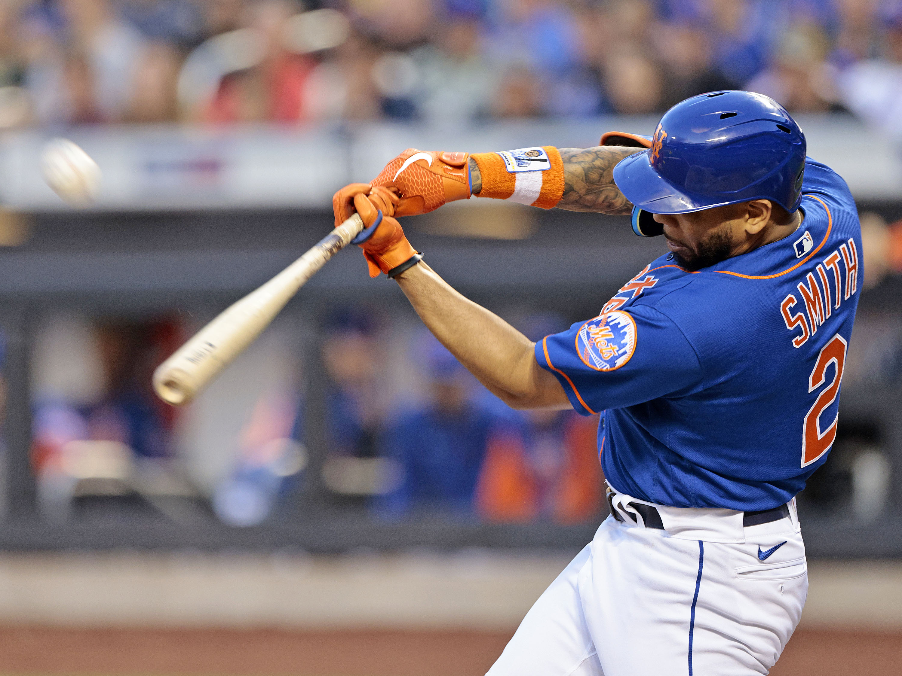 GettyNEW YORK, NY – MAY 28: Dominic Smith #2 of the New York Mets connects for a sacrifice fly in the bottom of the second inning against the Philadelphia Phillies at Citi Field on May 28, 2022 in New York City. (Photo by Christopher Pasatieri/Getty Images)