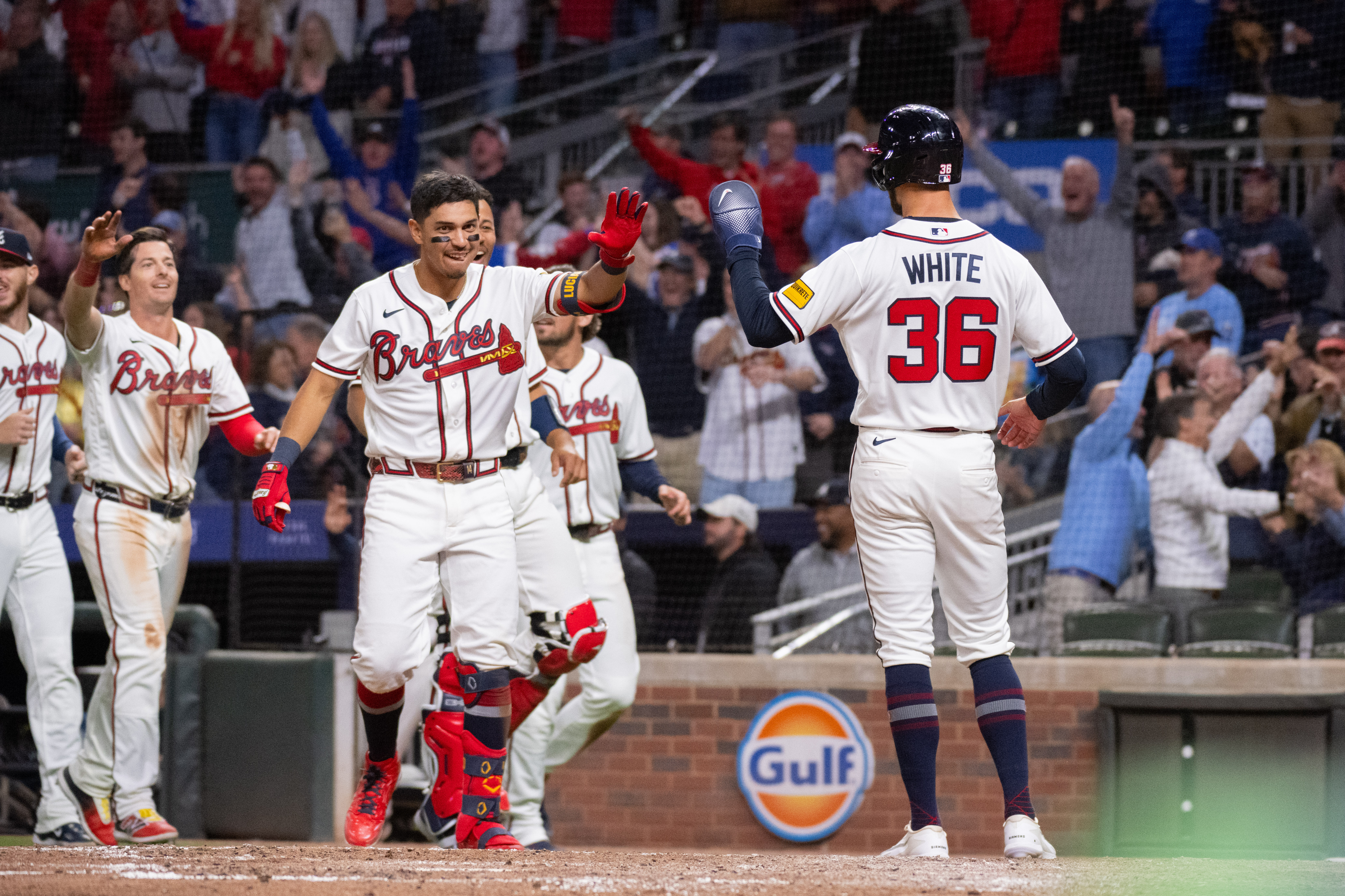 GettyATLANTA, GEORGIA – MARCH 28: Mike Yastrzemski #18 (left) and Mauricio Dubón #14 approach Eli White #36 of the Atlanta Braves at home plate after White scored the winning run on a Dominic Smith grand slam in the bottom of the ninth inning of a game against the Kansas City Royals at Truist Park on March 28, 2026 in Atlanta, Georgia. (Photo by Edward M. Pio Roda/Getty Images)