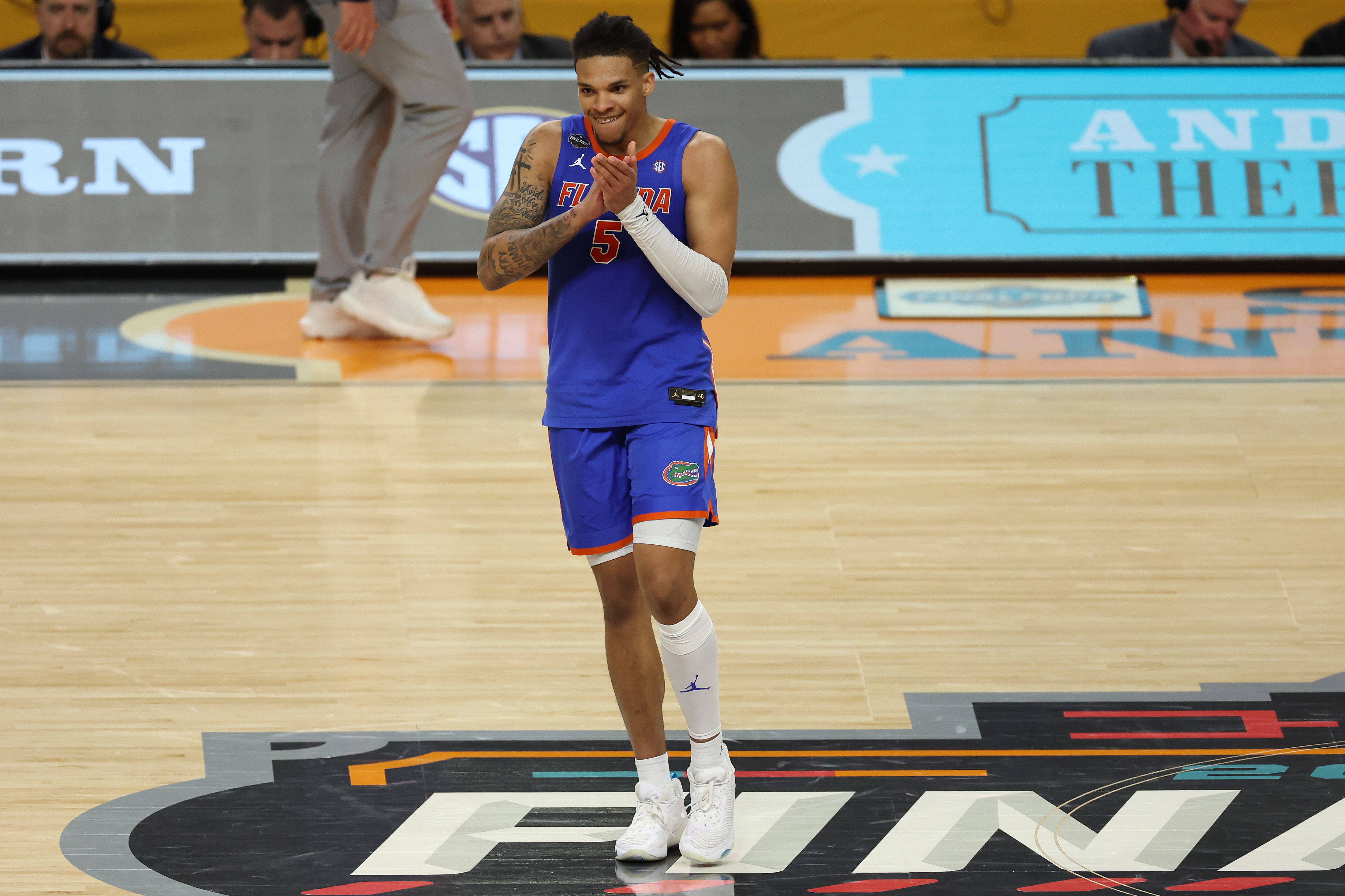 GettyWill Richard #5 of the Florida Gators celebrates after the second half in the Final Four game of the NCAA Men’s Basketball Tournament against the Auburn Tigers at the Alamodome on April 05, 2025 in San Antonio, Texas.
