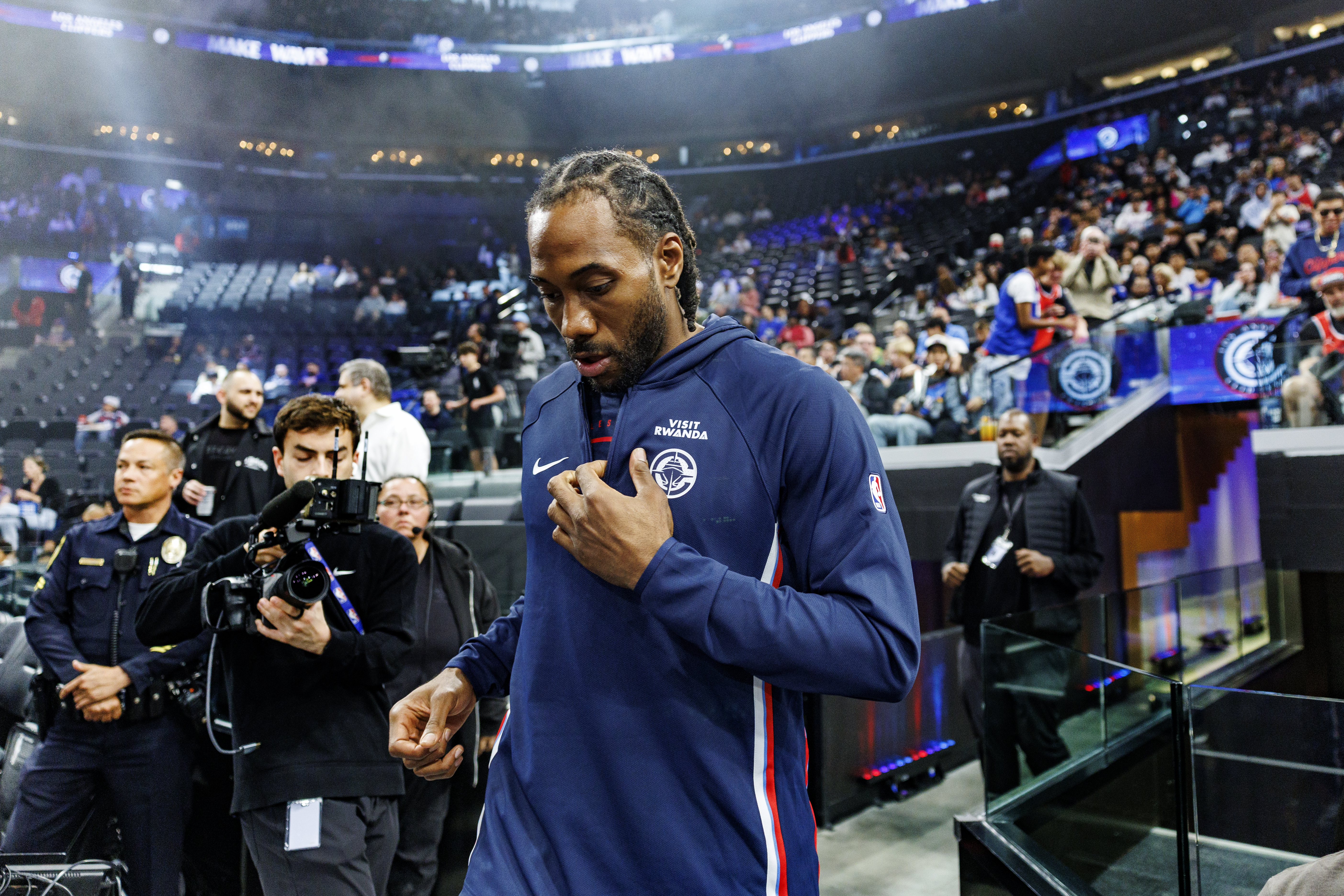 GettyLA Clippers forward Kawhi Leonard (2) runs onto the court for warmups before the game against the Oklahoma City Thunder at Intuit Dome on April 8, 2026 in Inglewood, CA.