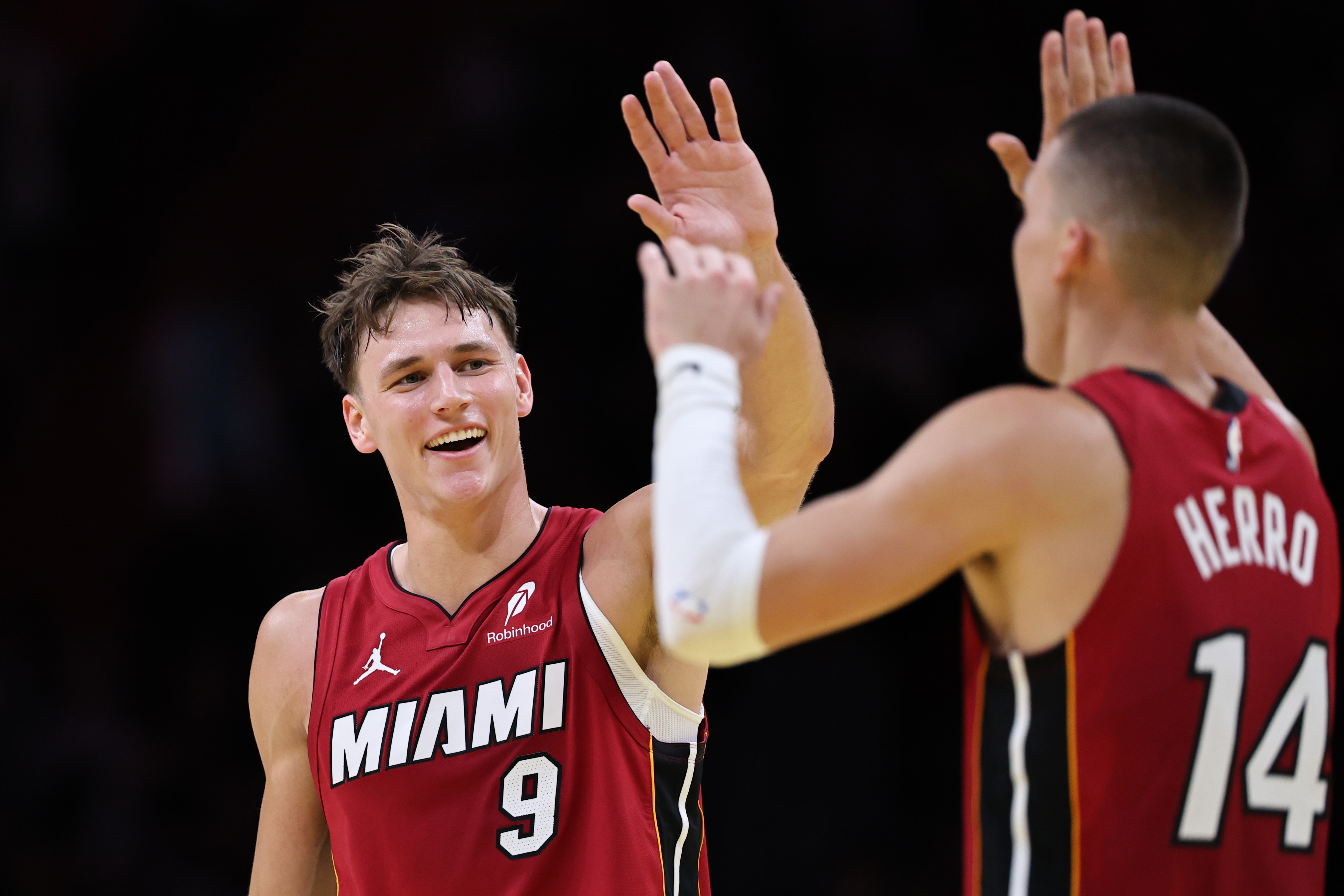 GettyPelle Larsson #9 of the Miami Heat high fives Tyler Herro #14 against the Milwaukee Bucks during the second half at Kaseya Center on November 26, 2025 in Miami, Florida.