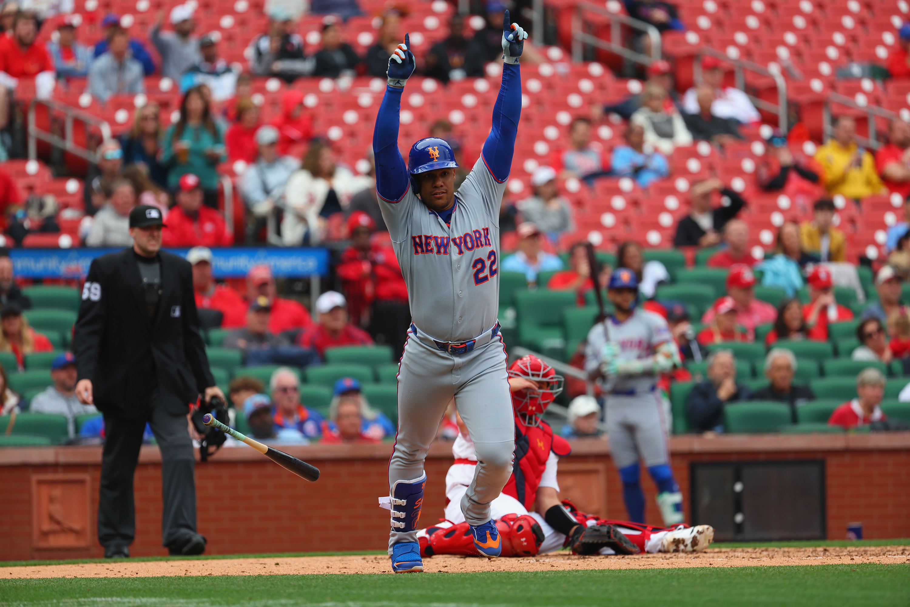 GettyJuan Soto #22 of the New York Mets celebrates after hitting a home run against the St. Louis Cardinals in the sixth inning at Busch Stadium on April 1, 2026 in St. Louis, Missouri.