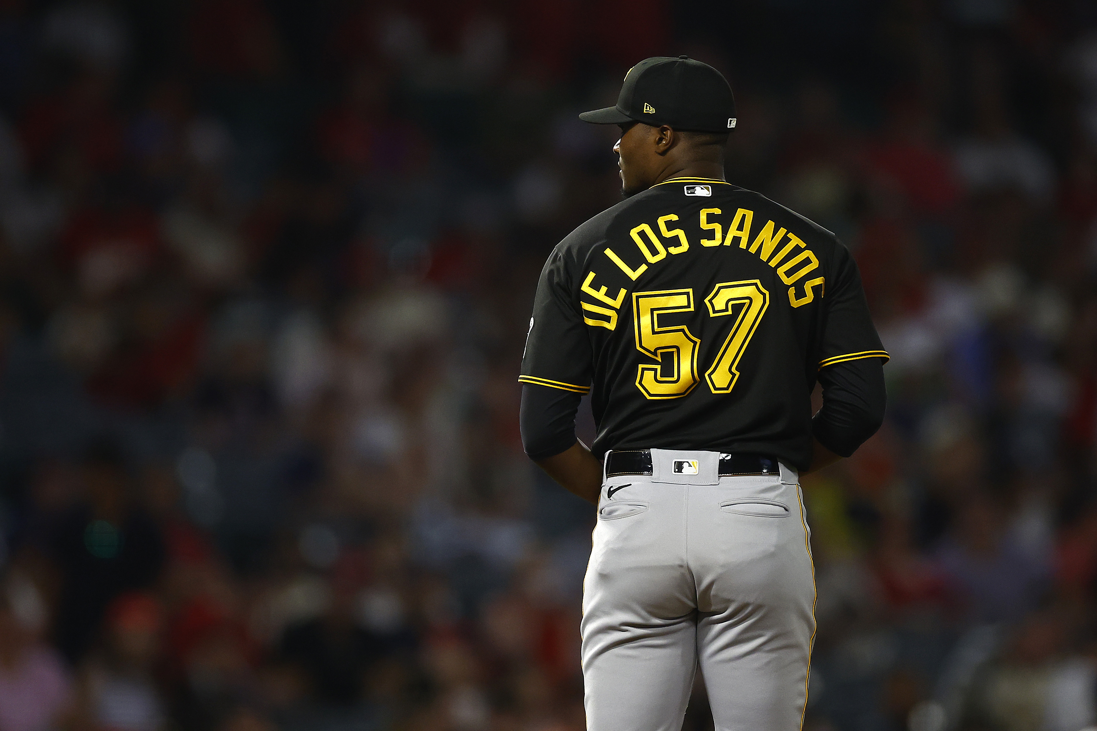GettyYerry De Los Santos #57 of the Pittsburgh Pirates in the eighth inning at Angel Stadium of Anaheim on July 21, 2023 in Anaheim, California.
