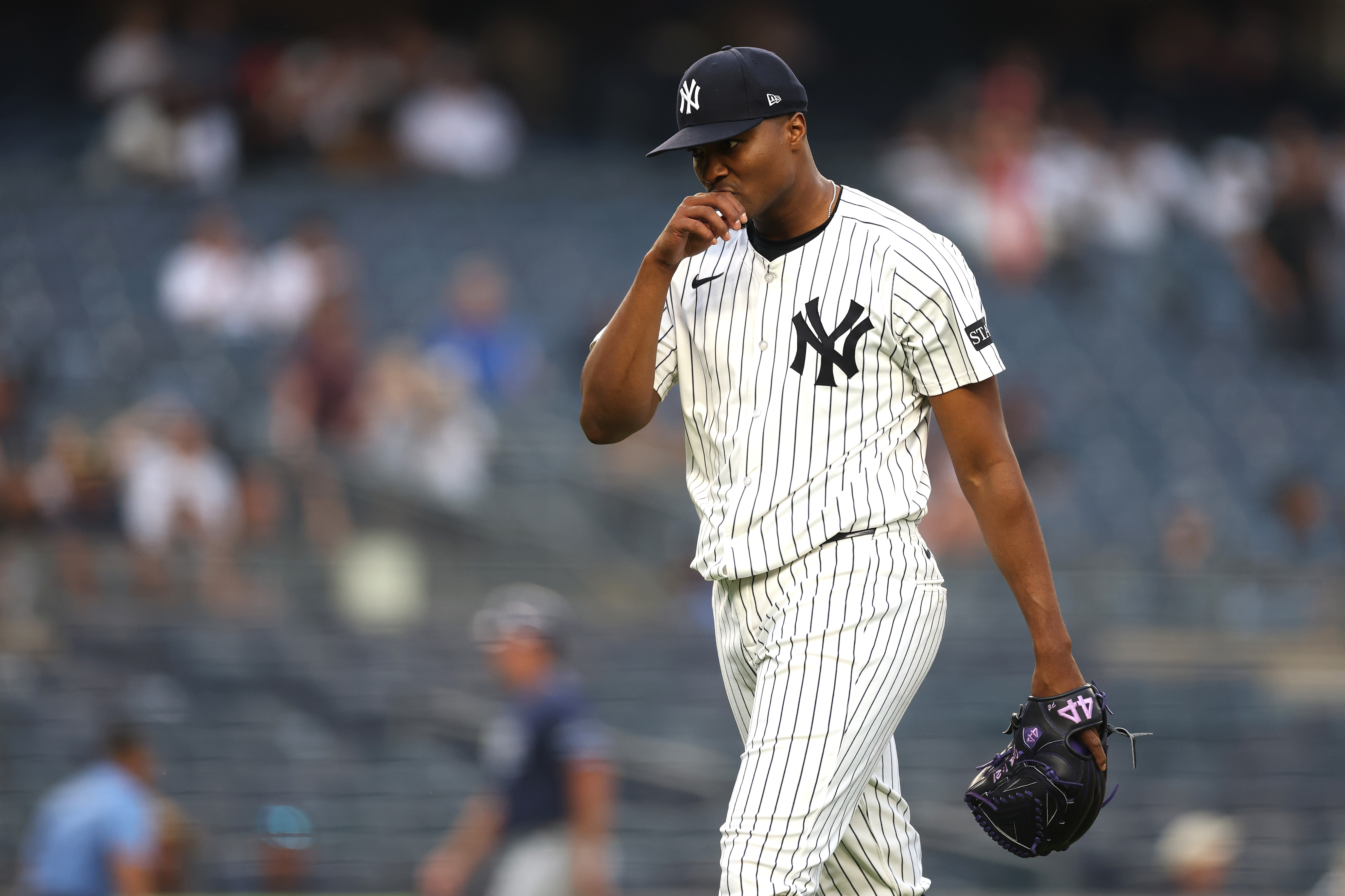 GettyYerry De los Santos #73 of the New York Yankees reacts during the seventh inning against the Tampa Bay Rays at Yankee Stadium on July 31, 2025 in the Bronx borough of New York City.