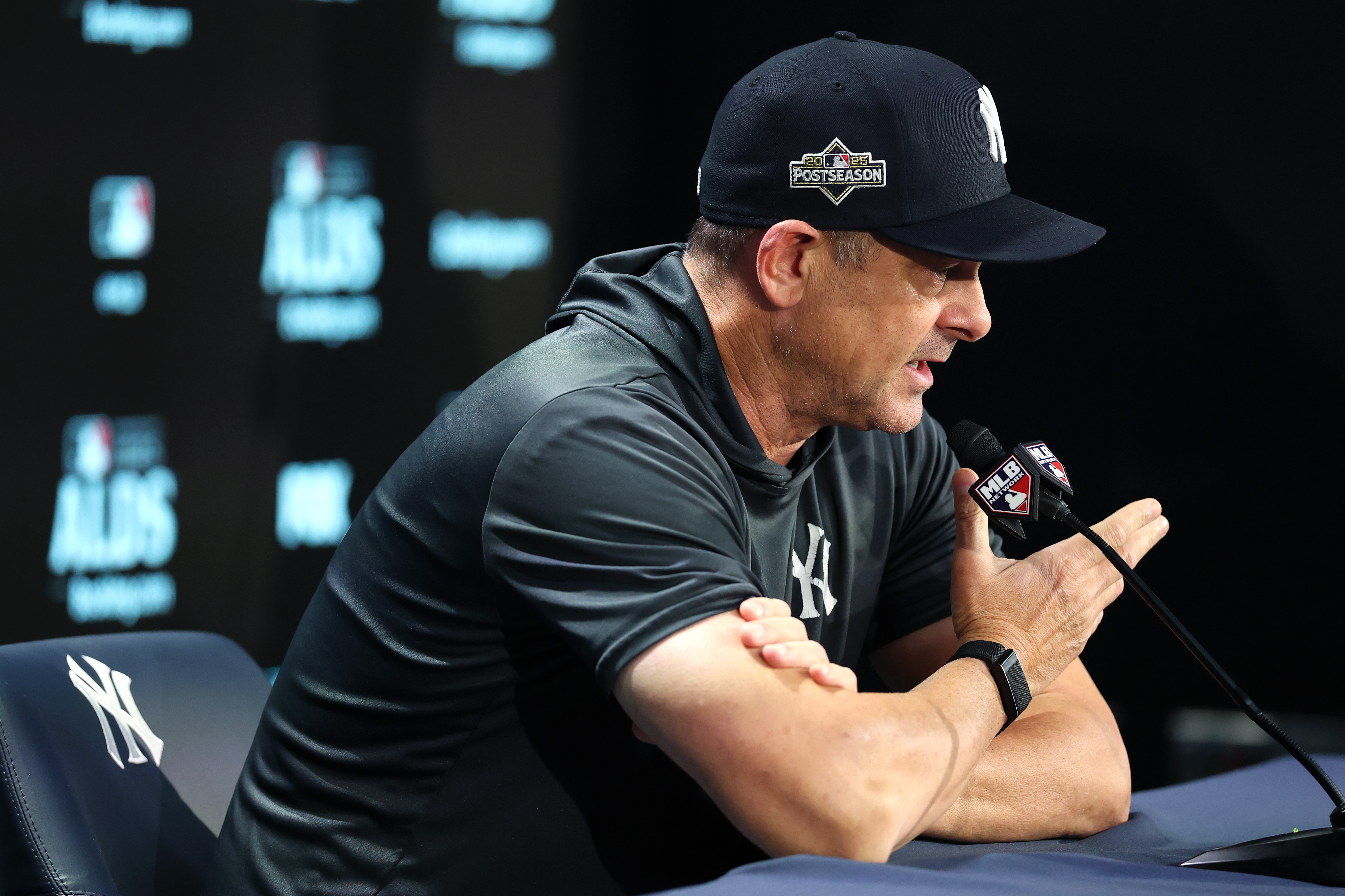 GettyManager Aaron Boone #17 of the New York Yankees speaks to the media before game four of the American League Division Series against the Toronto Blue Jays at Yankee Stadium on October 08, 2025 in New York City.