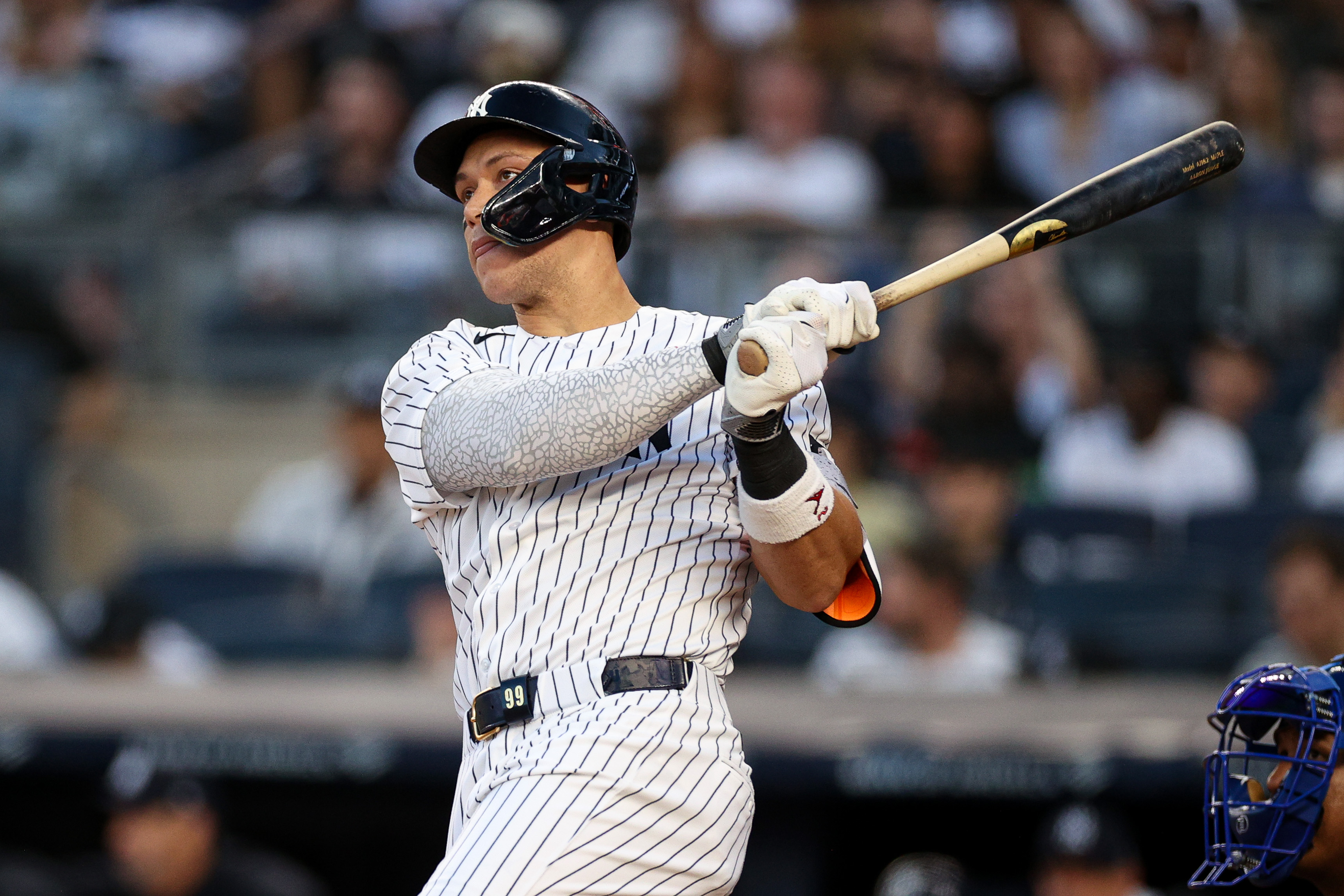 GettyNEW YORK, NEW YORK – APRIL 17: Aaron Judge #99 of the New York Yankees doubles in the first inning against the Kansas City Royals at Yankee Stadium on April 17, 2026 in New York City. (Photo by Evan Bernstein/Getty Images)