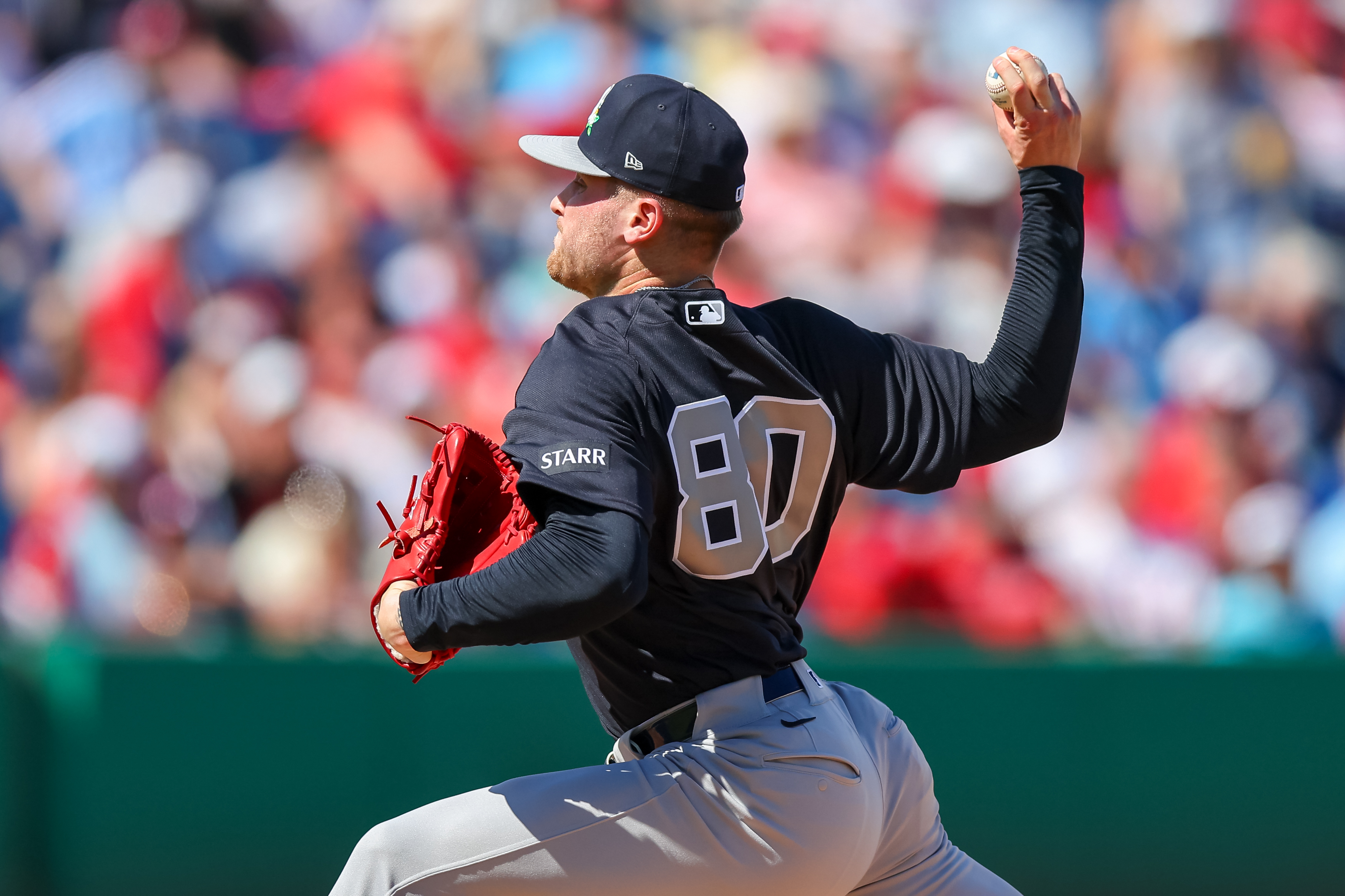 GettyCade Winquest #80 of the New York Yankees throws a pitch against the Philadelphia Phillies during the fourth inning of the spring training baseball game at BayCare Ballpark on March 1, 2026 in Clearwater, Florida.