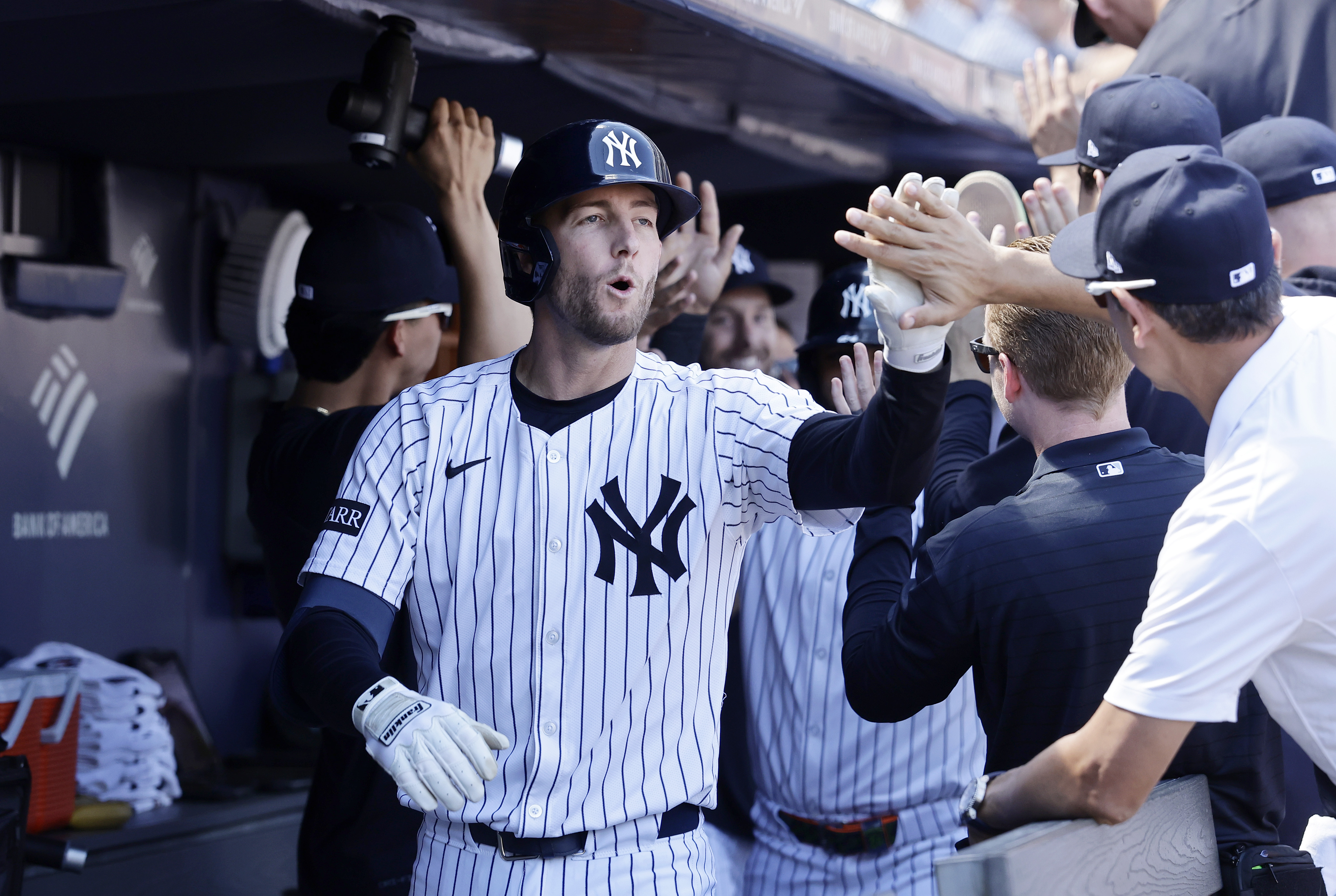 GettyRyan McMahon #19 of the New York Yankees celebrates his third inning three run home run against the Washington Nationals with his teammates in the dugout at Yankee Stadium on August 27, 2025 in New York City.