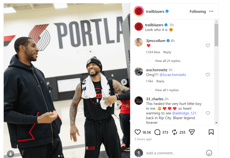 The team did not announce a formal role, jersey retirement or transaction involving Aldridge. But the post landed because of what Aldridge still means in Portland, and because CJ McCollum, another key figure from that era, responded with a heart emoji.