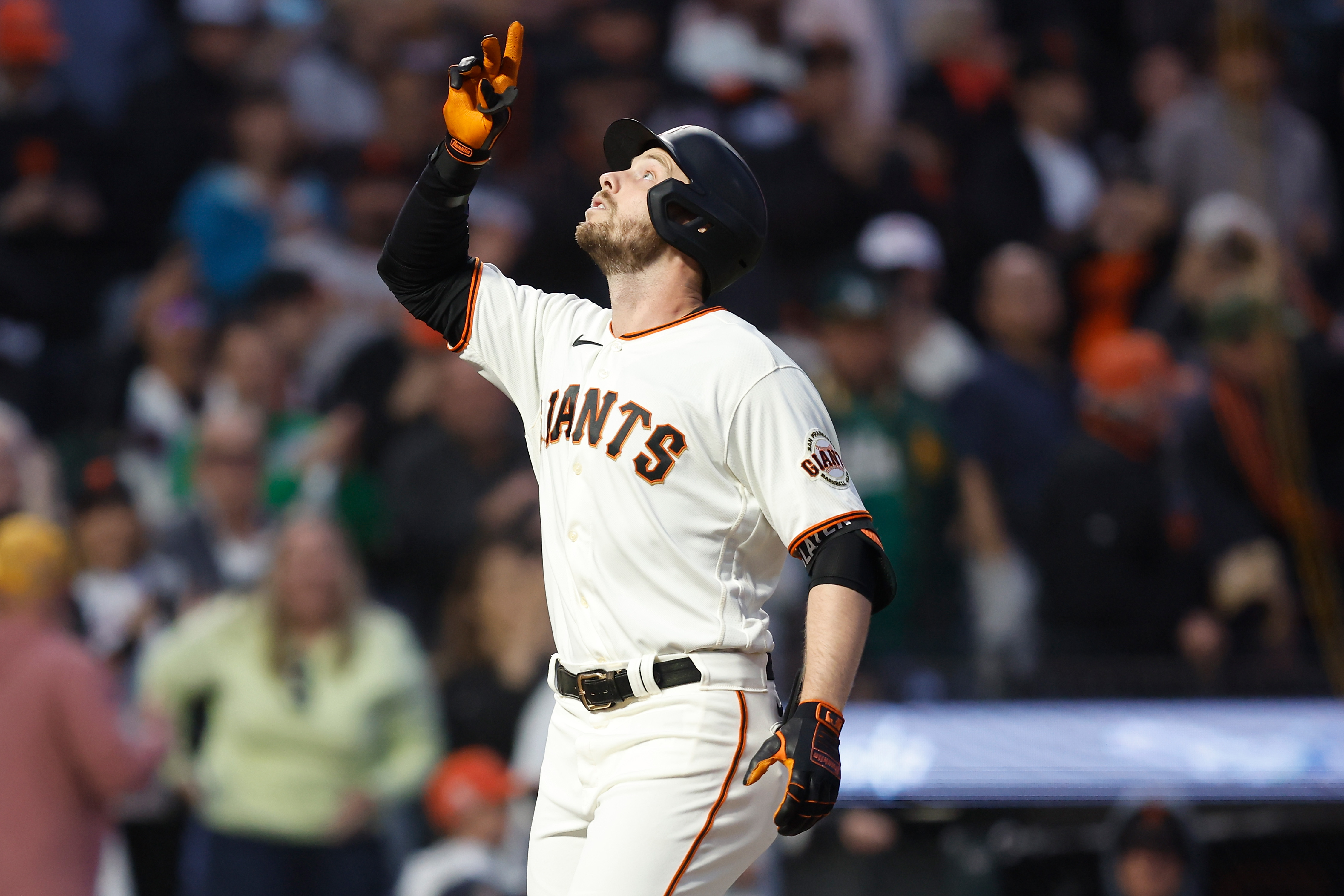 GettyAustin Slater #13 of the San Francisco Giants celebrates after hitting a two-run home run in the bottom of the sixth inning against the Oakland Athletics at Oracle Park on July 26, 2023 in San Francisco, California.