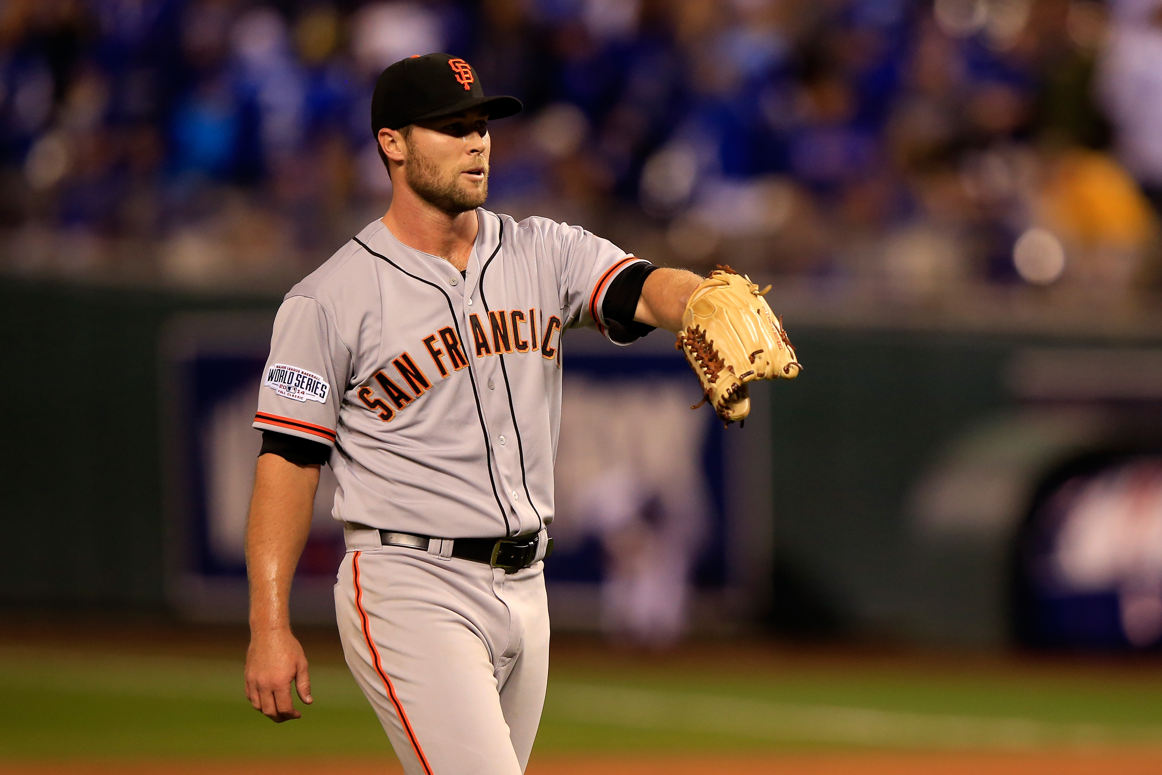 GettyHunter Strickland #60 of the San Francisco Giants celebrates after defeating the Kansas City Royals by a score of 7-1 to win Game One of the 2014 World Series at Kauffman Stadium on October 21, 2014 in Kansas City, Missouri.