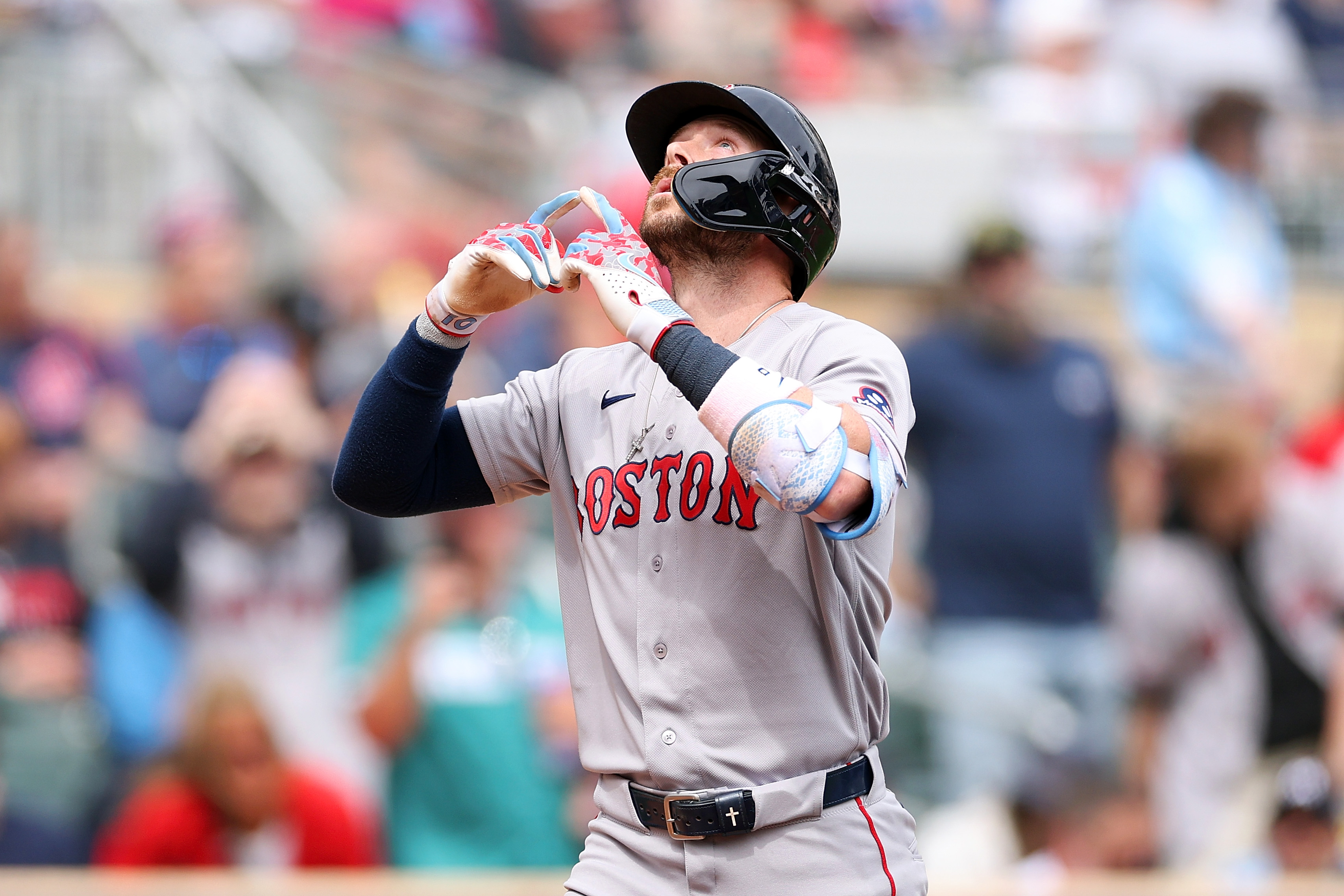 GettyTrevor Story #10 of the Boston Red Sox celebrates his three-run home run as he rounds the bases against the Minnesota Twins in the third inning at Target Field on April 15, 2026 in Minneapolis, Minnesota. All players are wearing the number 42 in honor of Jackie Robinson Day.