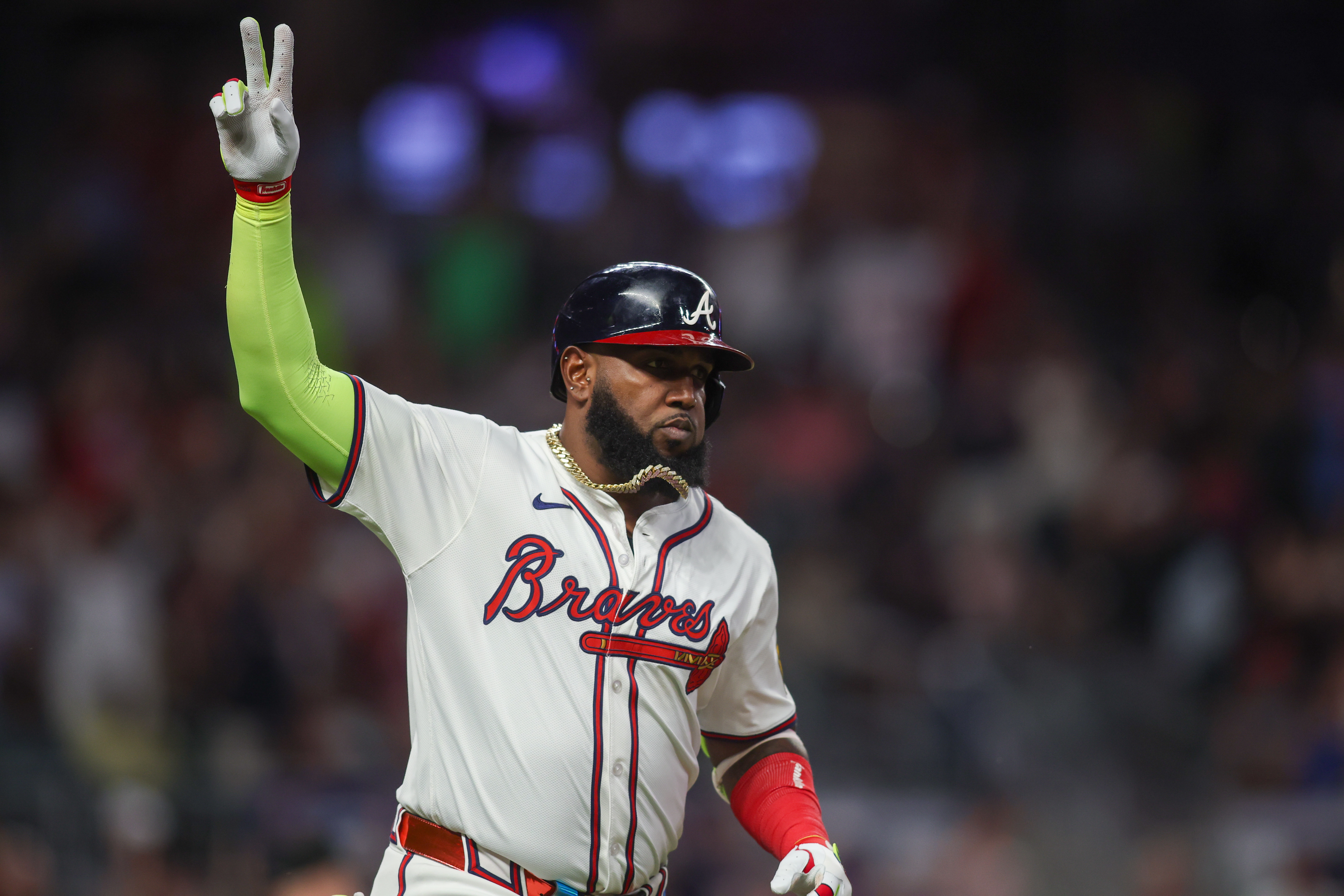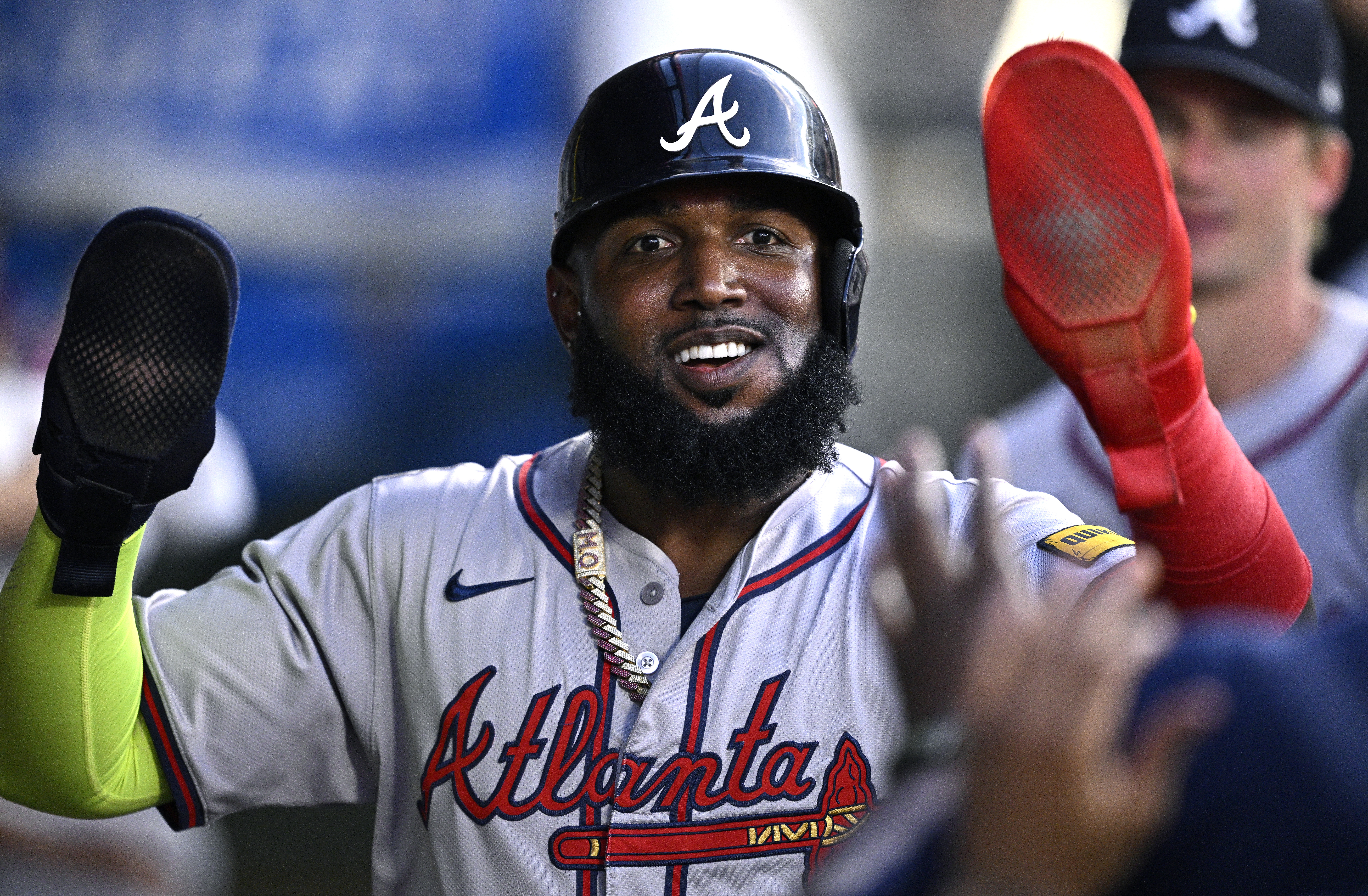 GettyMarcell Ozuna #20 of the Atlanta Braves celebrates after a home run against the Philadelphia Phillies in the sixth inning at Truist Park on August 20, 2024 in Atlanta, Georgia.