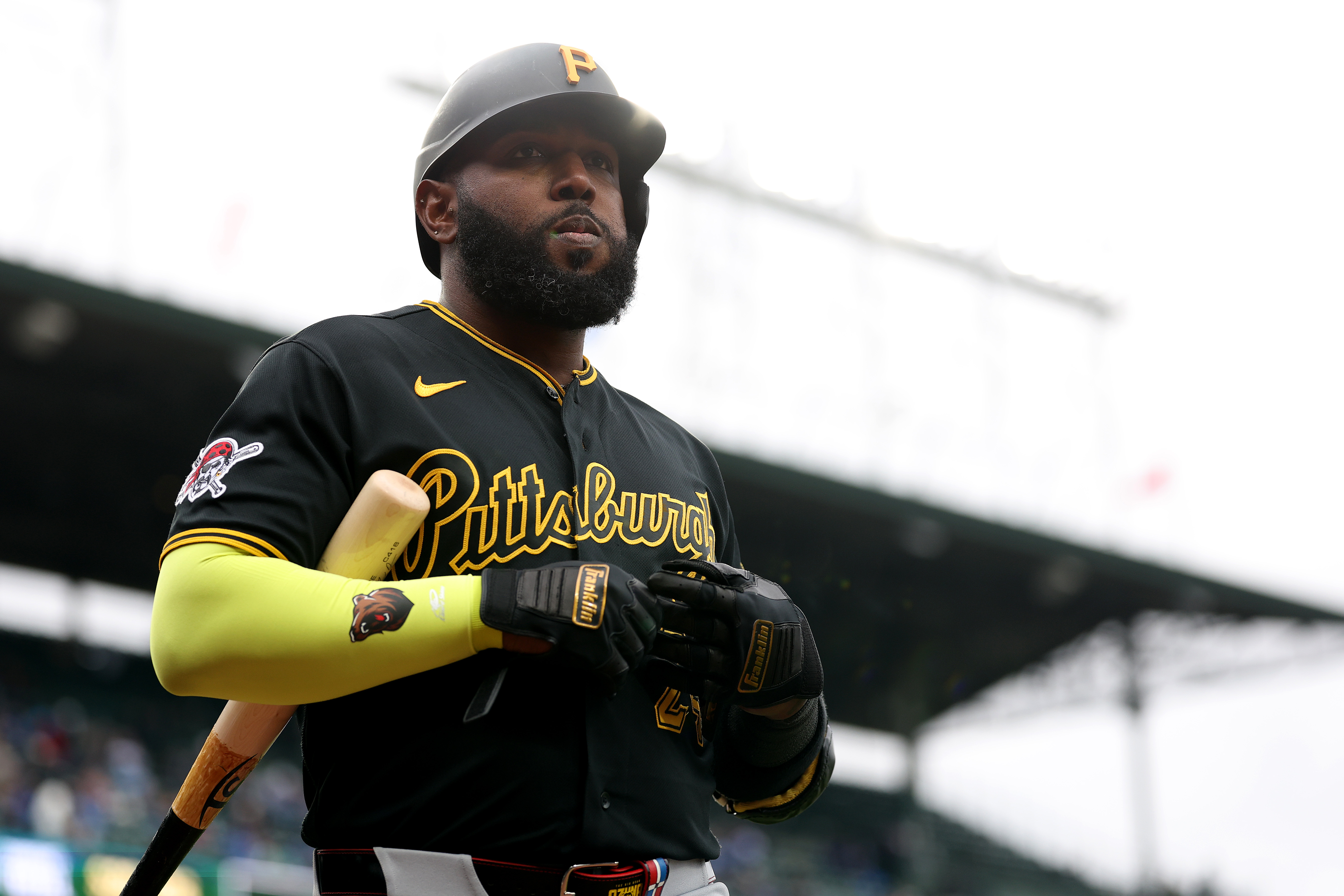 GettyMarcell Ozuna #24 of the Pittsburgh Pirates looks on against the Chicago Cubs at Wrigley Field on April 10, 2026 in Chicago, Illinois.