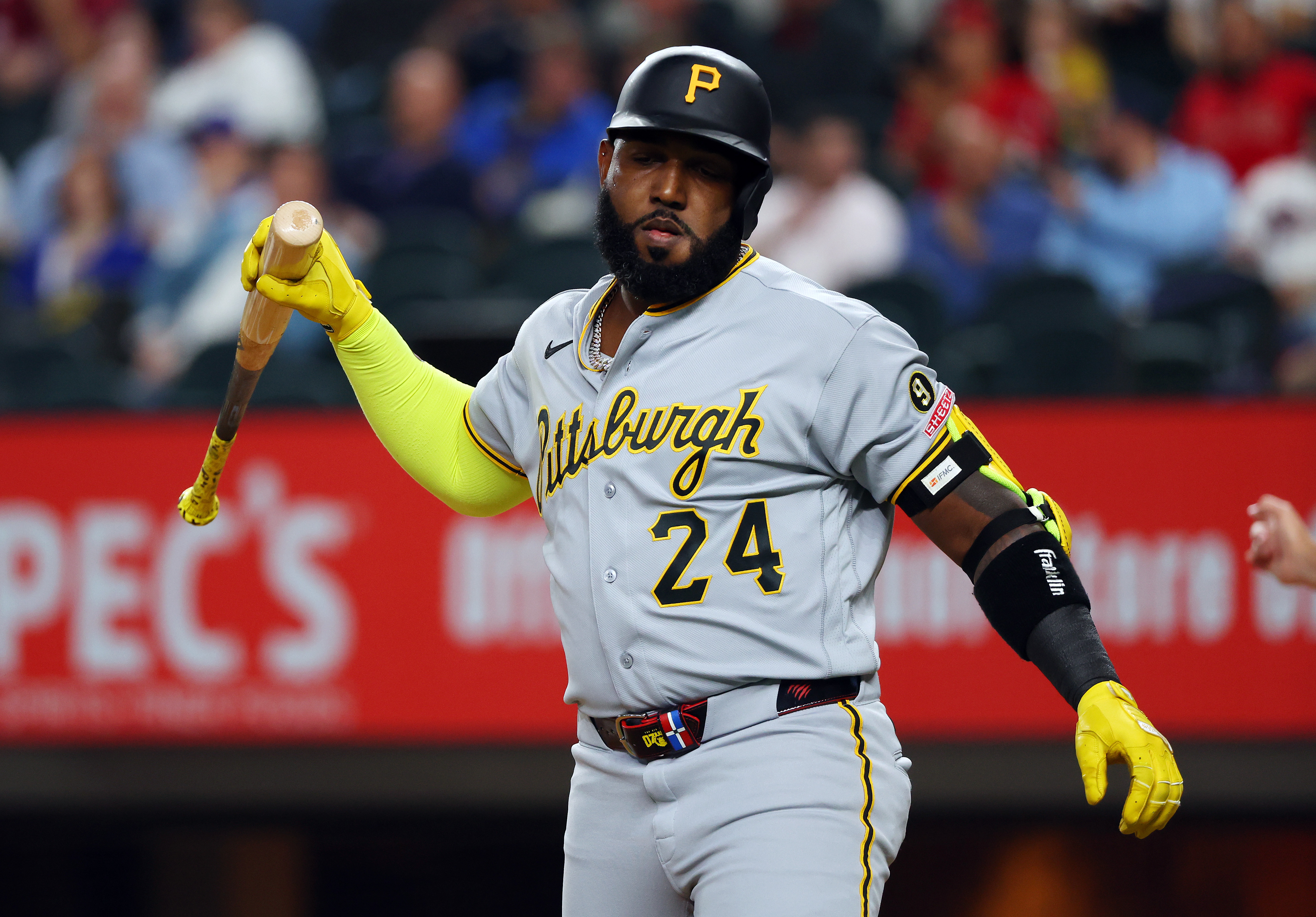 GettyMarcell Ozuna #24 of the Pittsburgh Pirates reacts after striking out in the first inning against the Texas Rangers at Globe Life Field on April 21, 2026 in Arlington, Texas.