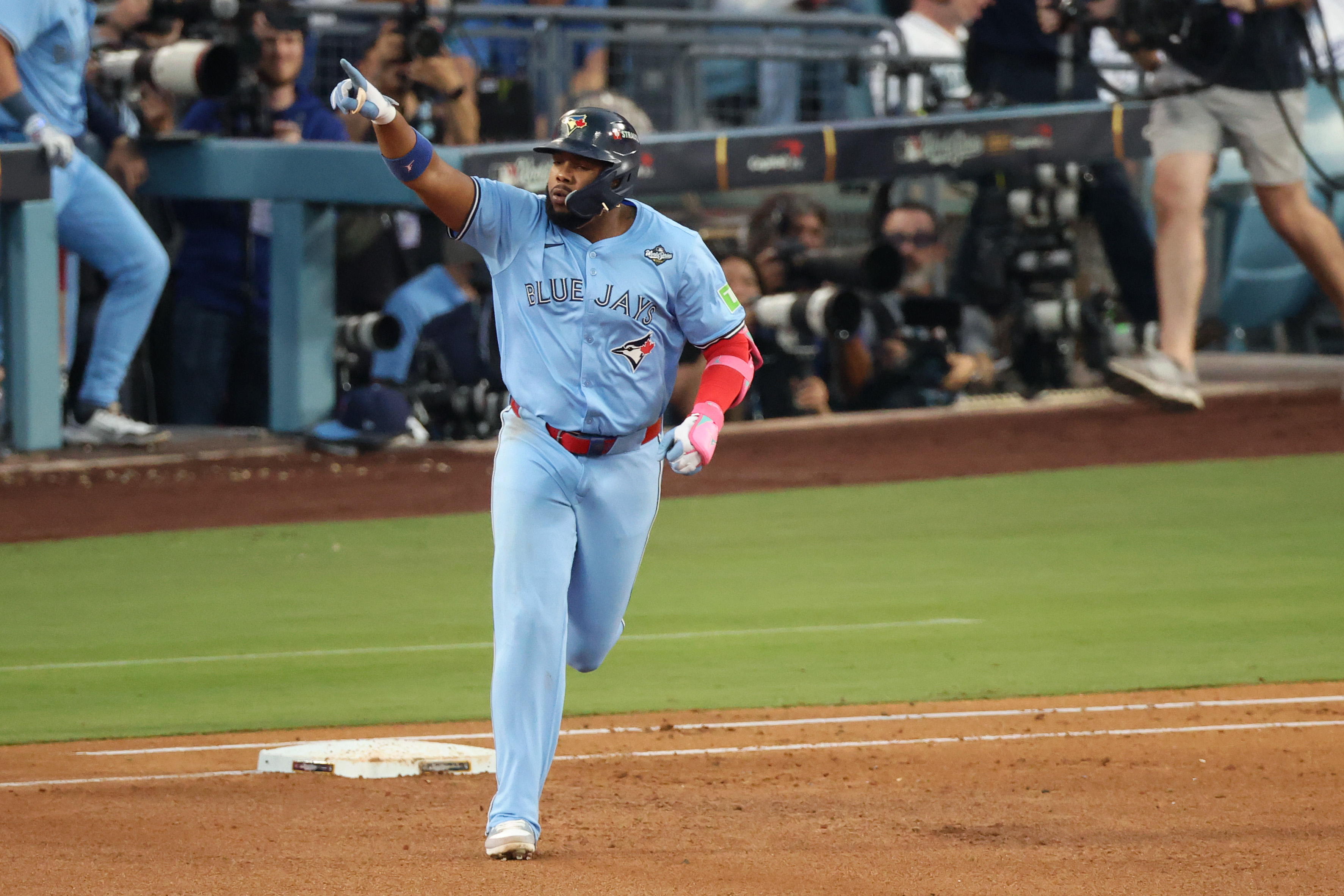 GettyVladimir Guerrero Jr. #27 of the Toronto Blue Jays celebrates after hitting a two-run home run in the third inning against the Los Angeles Dodgers in game four of the 2025 World Series at Dodger Stadium on October 28, 2025 in Los Angeles, California.
