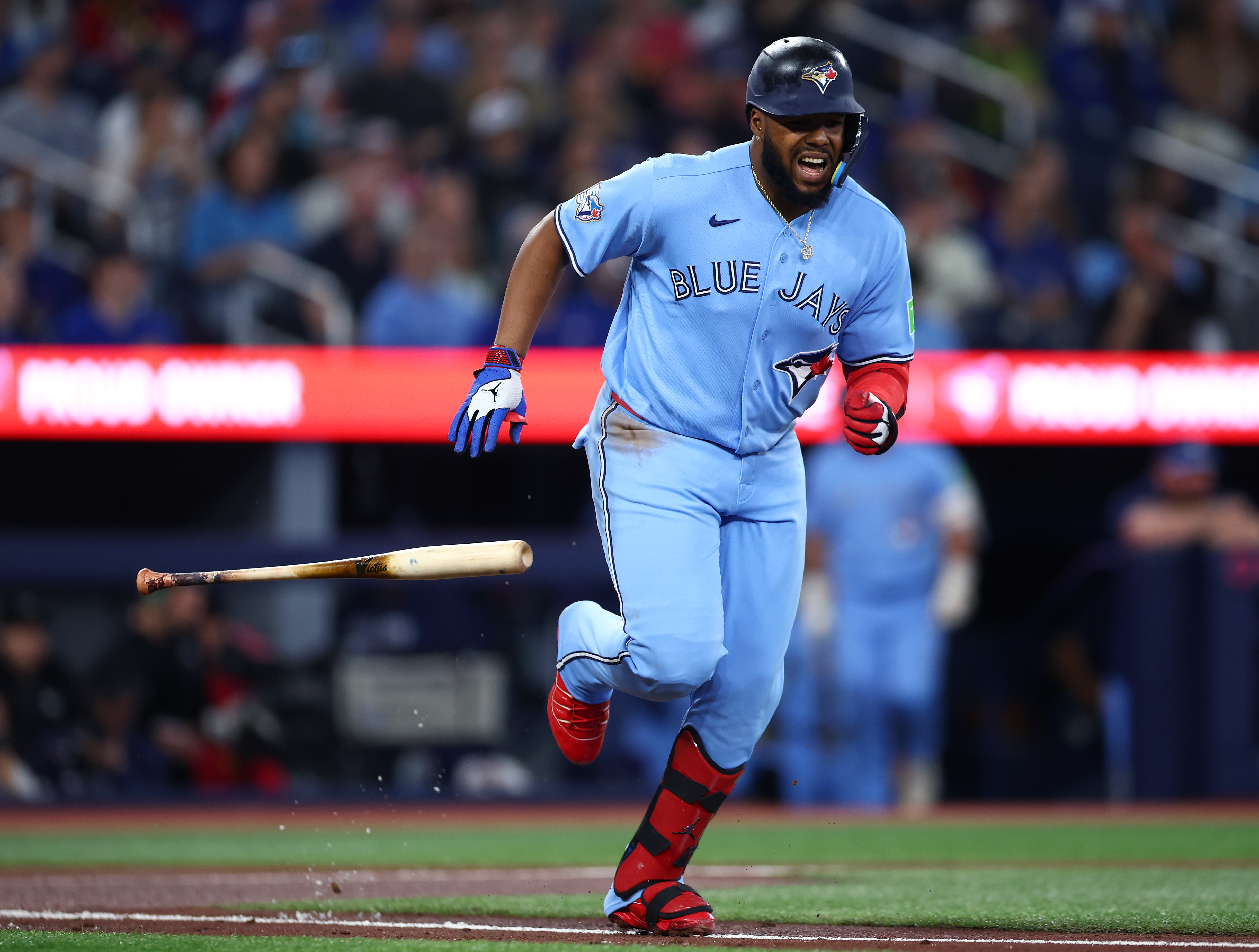 GettyVladimir Guerrero Jr. #27 of the Toronto Blue Jays reacts as he runs to first base in the first inning of a game against the Minnesota Twins at Rogers Centre on April 11, 2026 in Toronto, Ontario, Canada.