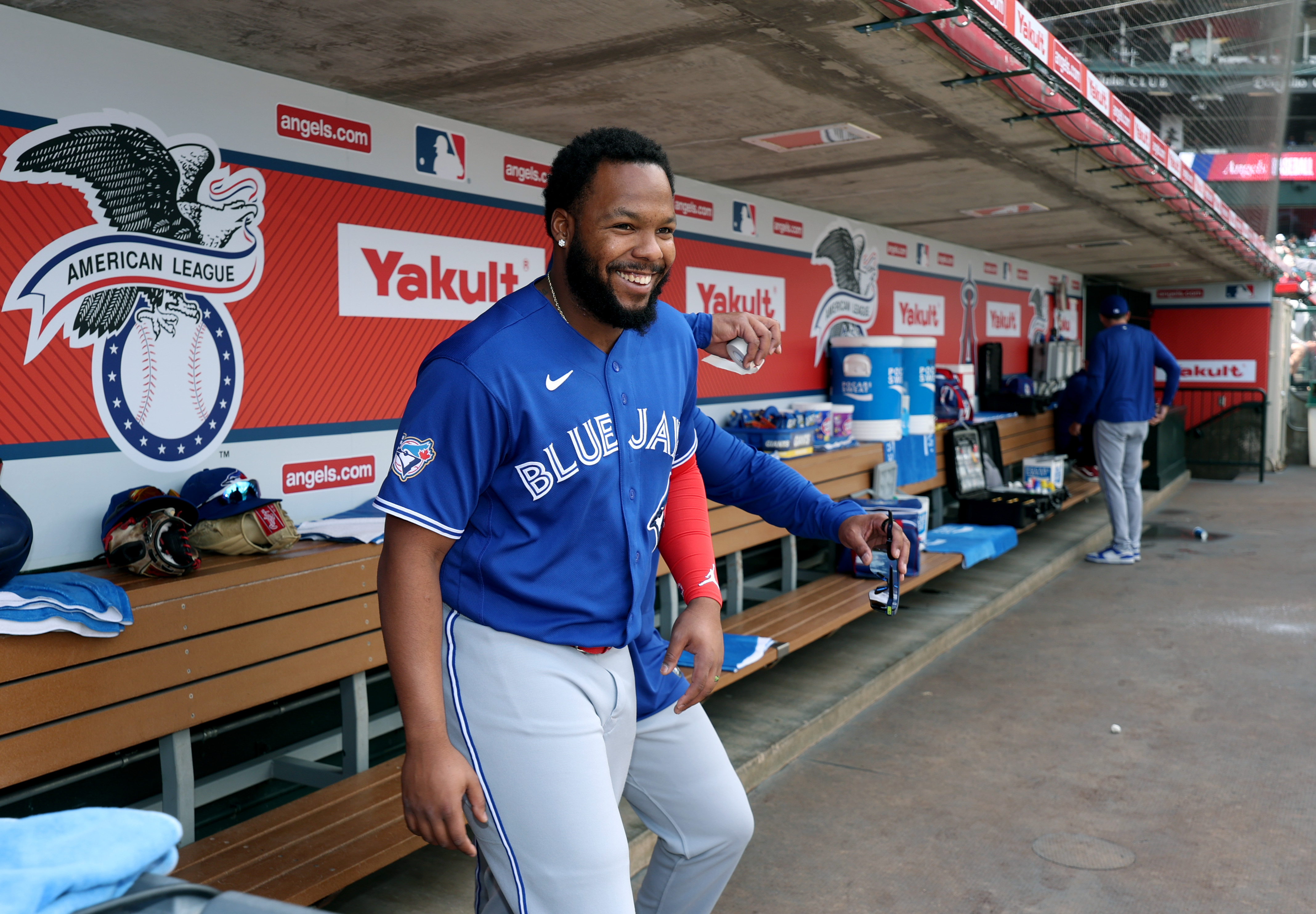 GettyVladimir Guerrero Jr. #27 of the Toronto Blue Jays laughs in the dugout before the game against the Los Angeles Angels at Angel Stadium of Anaheim on April 22, 2026 in Anaheim, California.