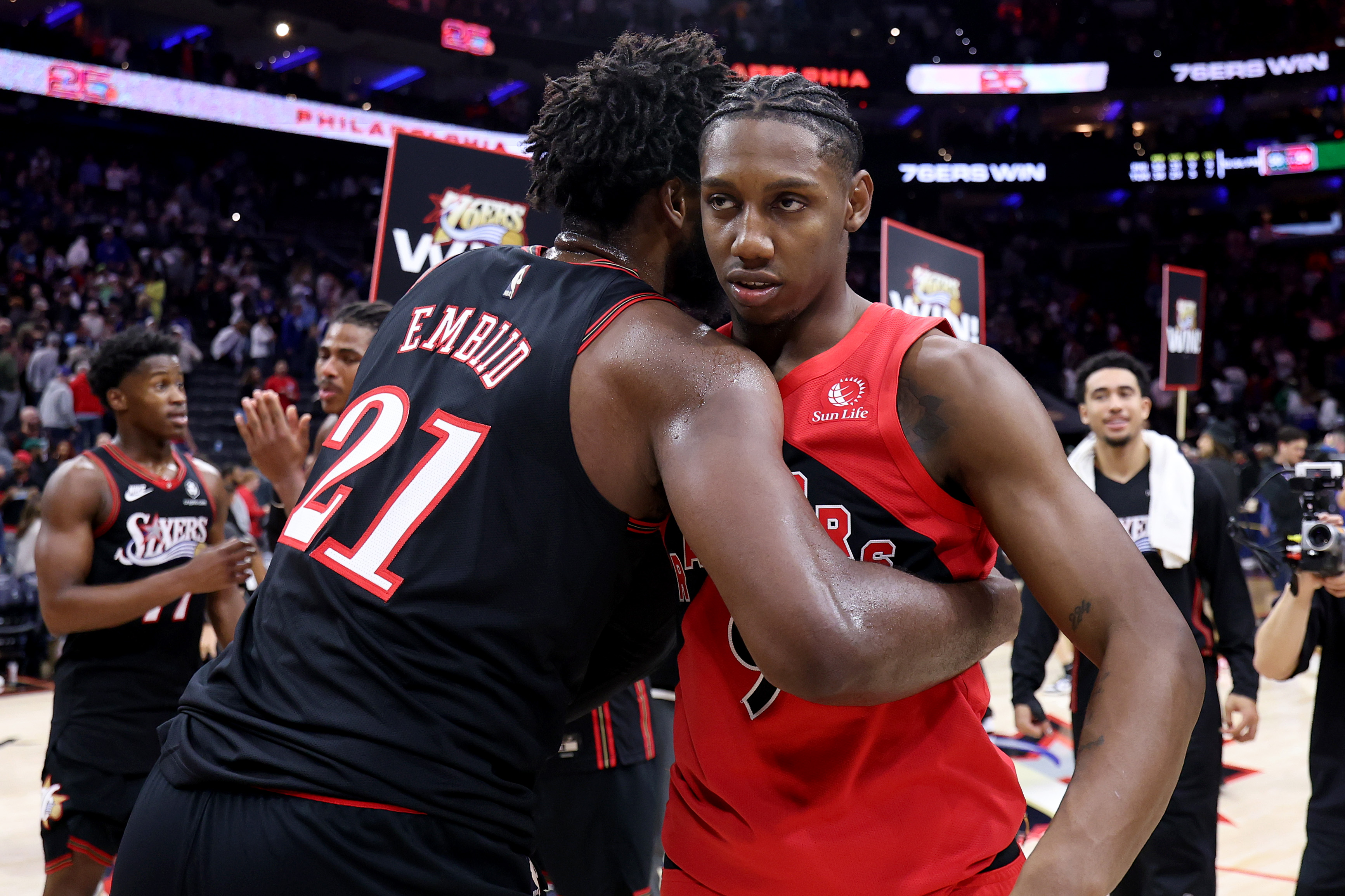GettyRJ Barrett #9 of the Toronto Raptors hugs Joel Embiid #21 of the Philadelphia 76ers after a game at Xfinity Mobile Arena on November 08, 2025 in Philadelphia, Pennsylvania.