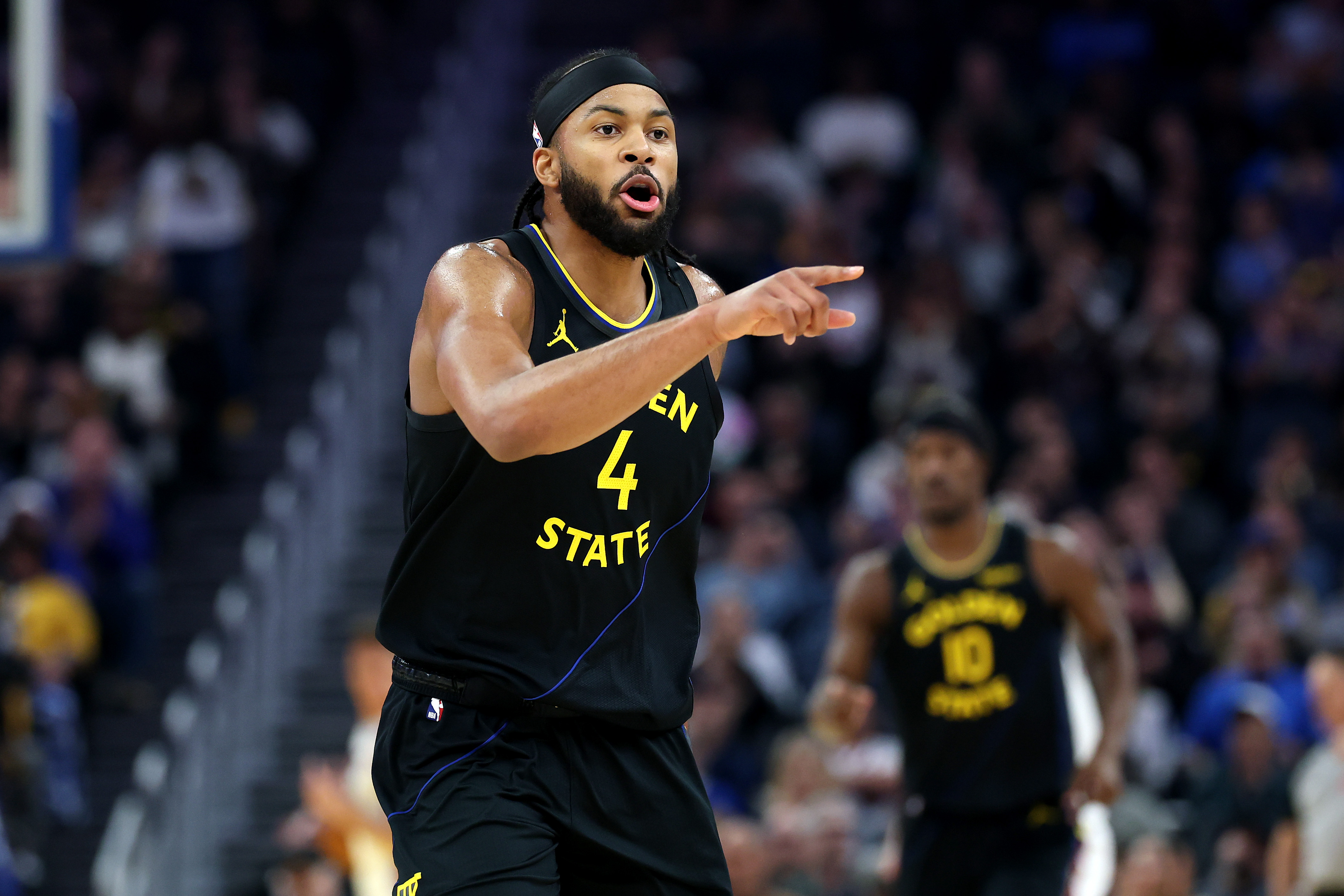 GettySAN FRANCISCO, CALIFORNIA – JANUARY 19: Moses Moody #4 of the Golden State Warriors reacts after he made a basket against the Miami Heat during the first half at Chase Center on January 19, 2026 in San Francisco, California. (Photo by Ezra Shaw/Getty Images)