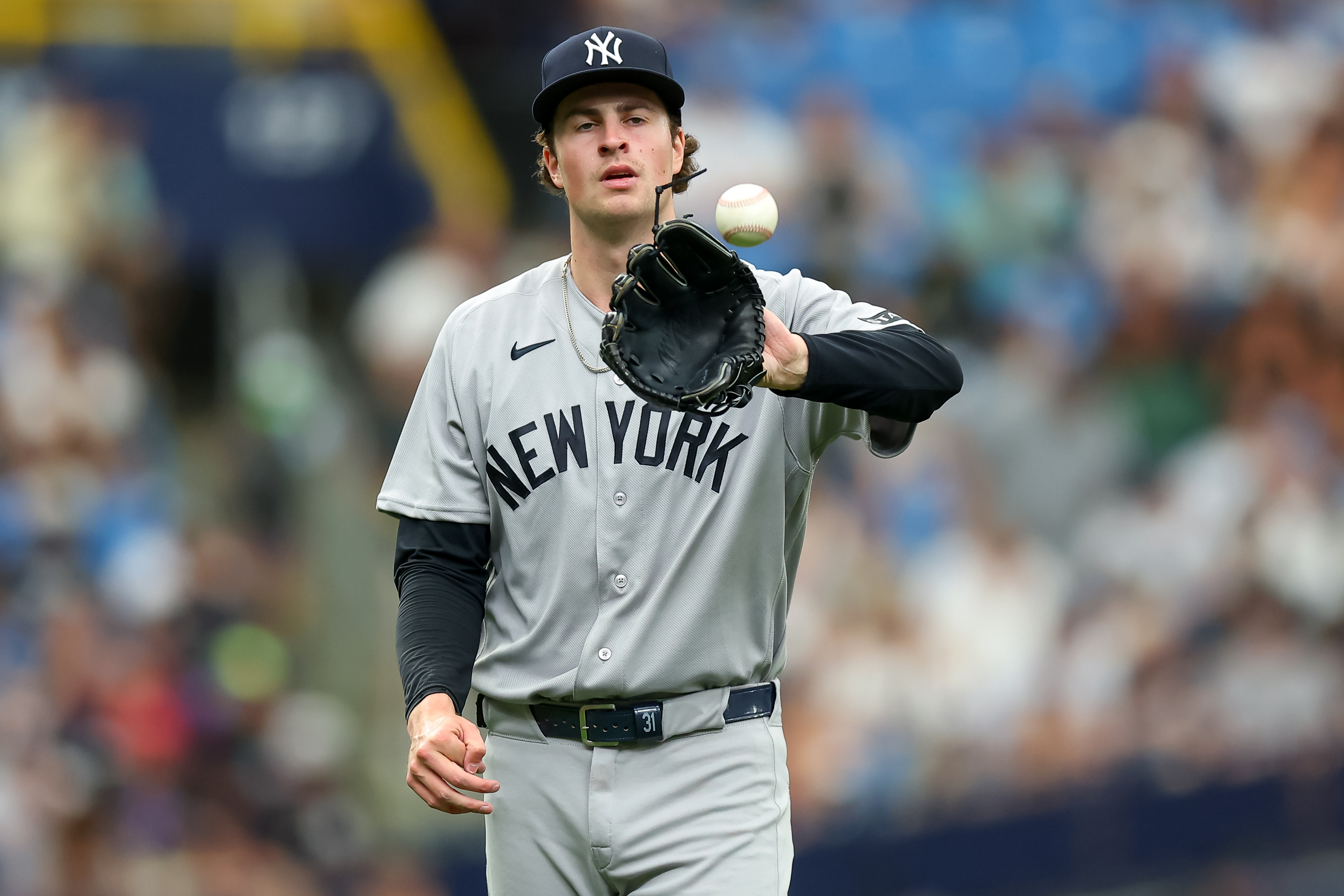 ST. PETERSBURG, FL – APRIL 12: Cam Schlittler #31 of the New York Yankees reacts after giving up a hit against the Tampa Bay Rays during the second inning of a baseball game at Tropicana Field on April 10, 2026 in St. Petersburg, Florida. (Photo by Mike Carlson/Getty Images)