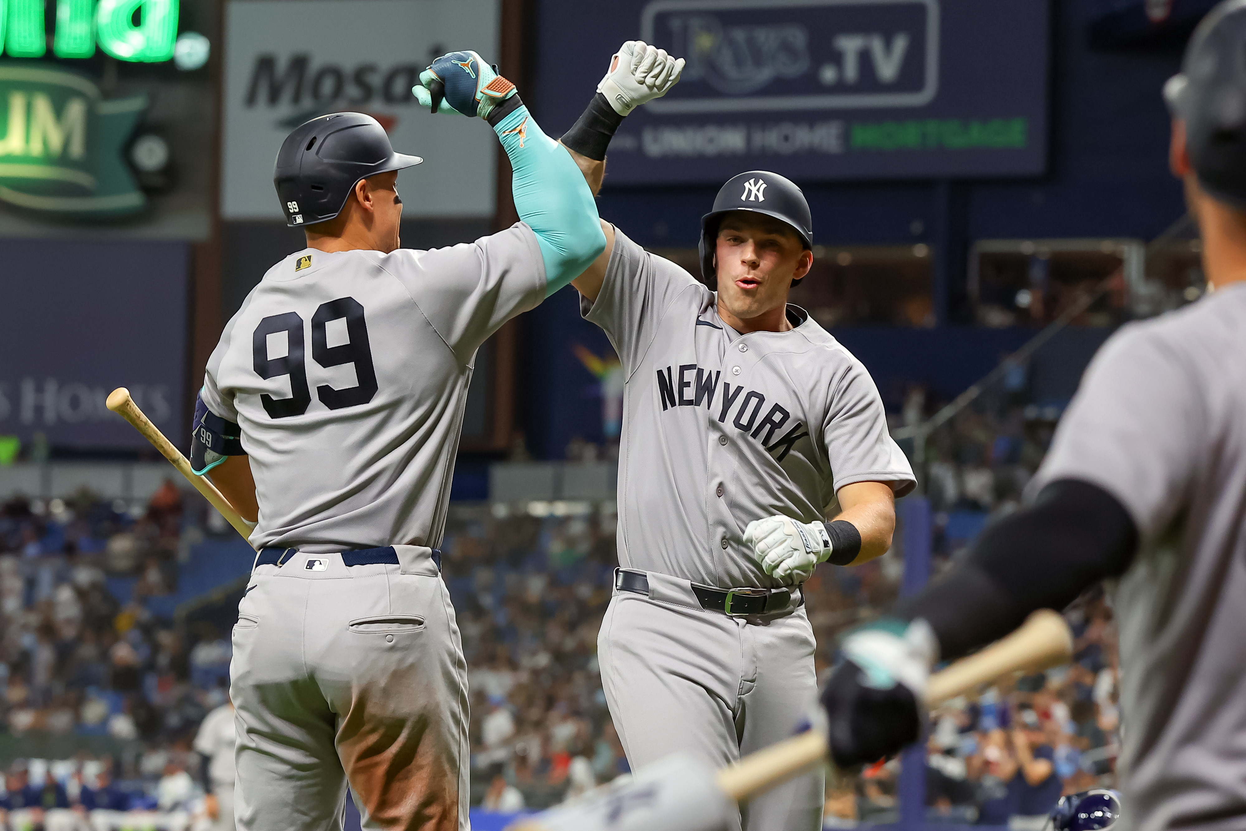 GettyST. PETERSBURG, FL – APRIL 10: Ben Rice #22 of the New York Yankees, right, celebrates his home run with Aaron Judge #99 against the Tampa Bay Rays during the eighth inning of a baseball game at Tropicana Field on April 10, 2026 in St. Petersburg, Florida. (Photo by Mike Carlson/Getty Images)