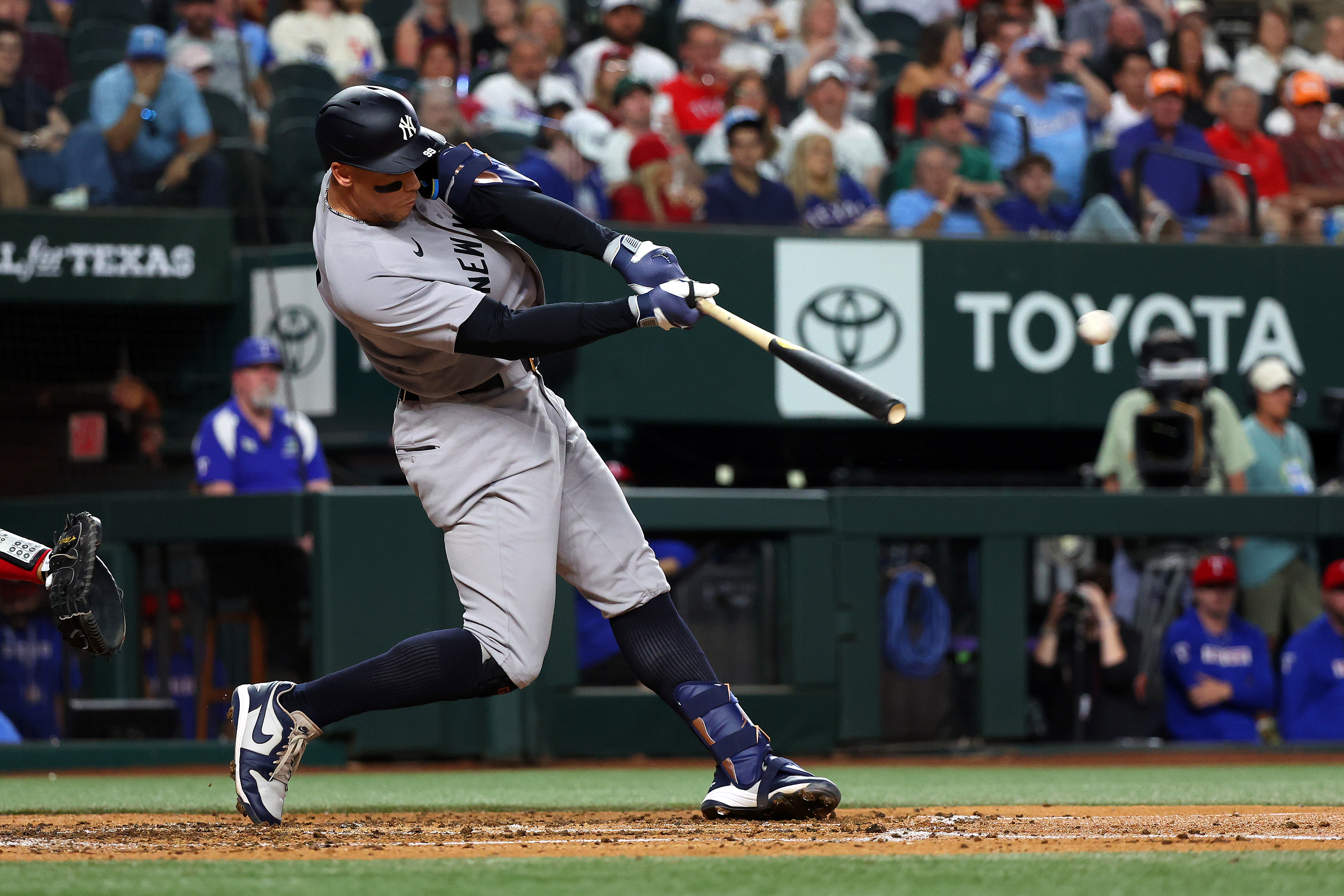 GettyARLINGTON, TEXAS – APRIL 27: Aaron Judge #99 of the New York Yankees hits a solo home run in the second inning against the Texas Rangers at Globe Life Field on April 27, 2026 in Arlington, Texas. (Photo by Richard Rodriguez/Getty Images)